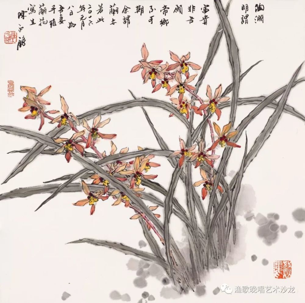 做了八十多天彭泽令即辞官回家的陶渊明,以其朴素真挚的叙述,创造出一种宁静悠适、乐天自然的田园意境。陈永锵将名句“富贵非吾愿,帝乡不可期”引入兰花小品之中,托物言志,以示艺术家的心境与向往;另一方面,此兰为其妻手植,那么这里所表达的就不单指陈永锵个人的追求,既表现了夫妇二人的伉俪情深,也彰显出这个艺术之家对自由生活和高洁品质的追求。