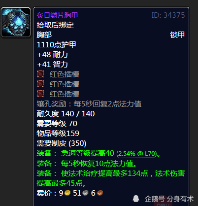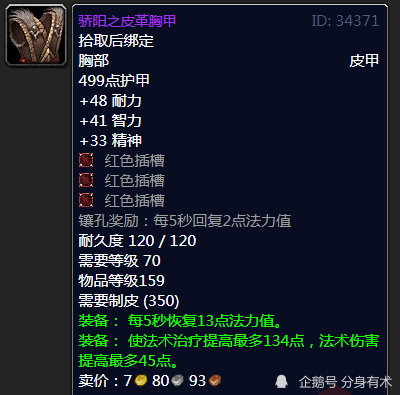 骄阳之皮革胸甲:图纸产自太阳井高地,奶德极品衣服。134点治疗加成可以说得上是恐怖,还自带3个红色宝石槽堪称完美,虽然图纸也不贵,但是不是制皮的玩家做不了,这也是这件装备唯一的缺点了吧。