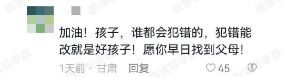 网友们给他加油、打赏,“谁都会犯错,能改就是好孩子”,还要帮他寻亲。