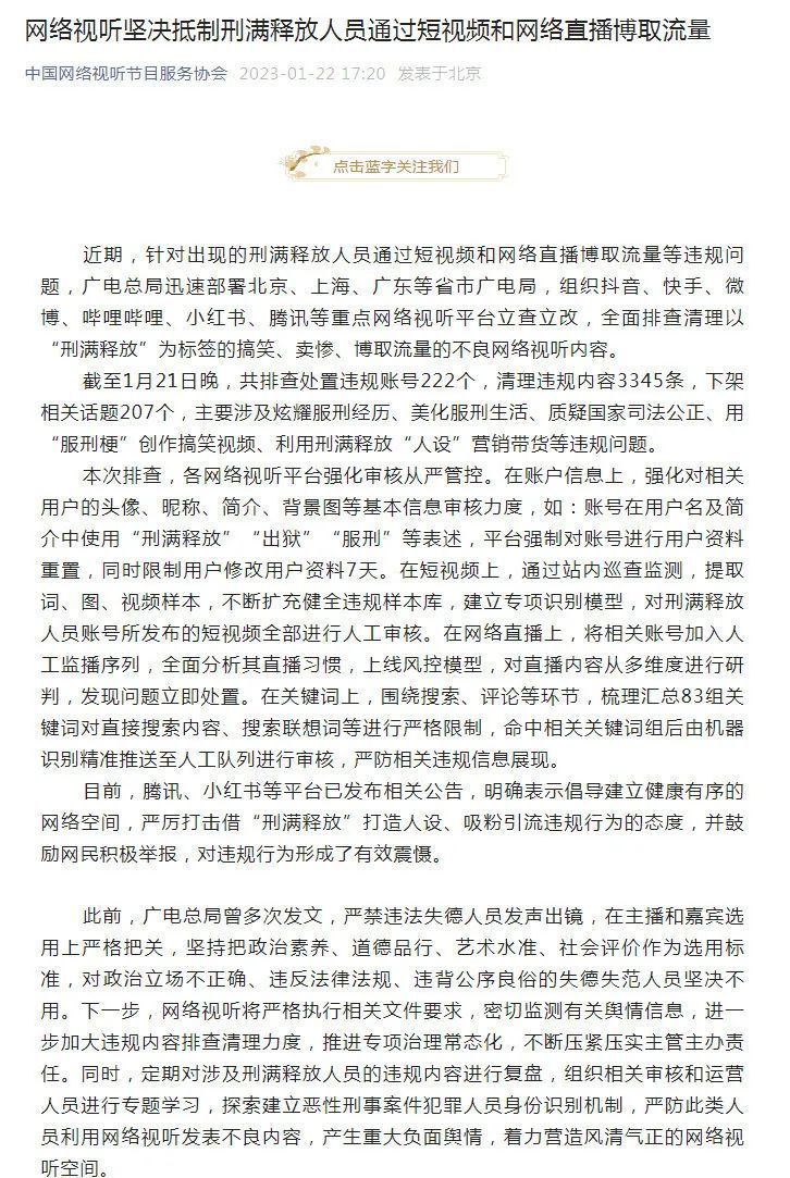 坚决抵制刑满释放人员通过短视频和网络直播博取流量。