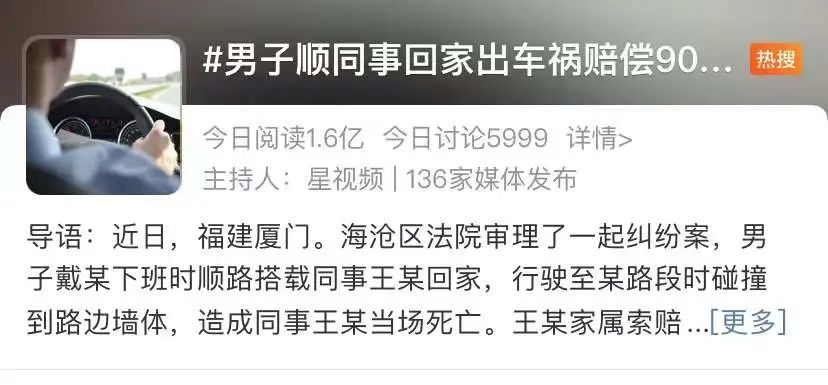 近日,一则“男子顺同事回家出车祸赔偿90万”的新闻冲上了热搜榜,引发1.6亿人关注,引发了网友大量的热议。