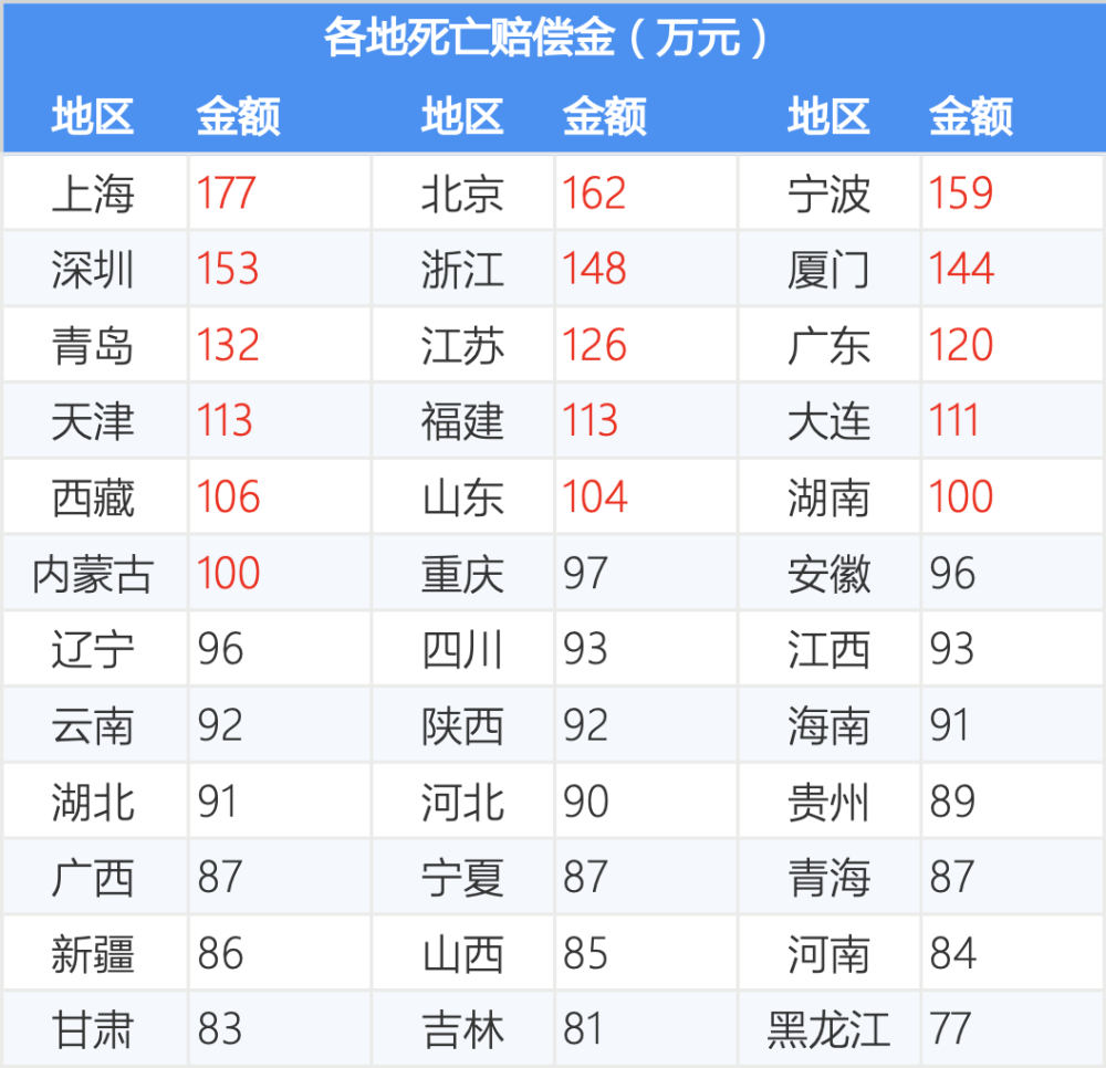 死亡赔偿金半数地区过百万,最低77万!