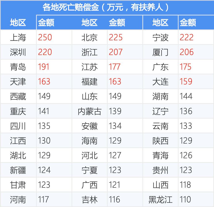 如有扶养人的话全部超百万,多地超200万,如有扶养义务,以扶养15年测算,6个地区超200万,分别是上海、北京、宁波、深圳、浙江和厦门,12个地区超150万,其余地区全部超百万。