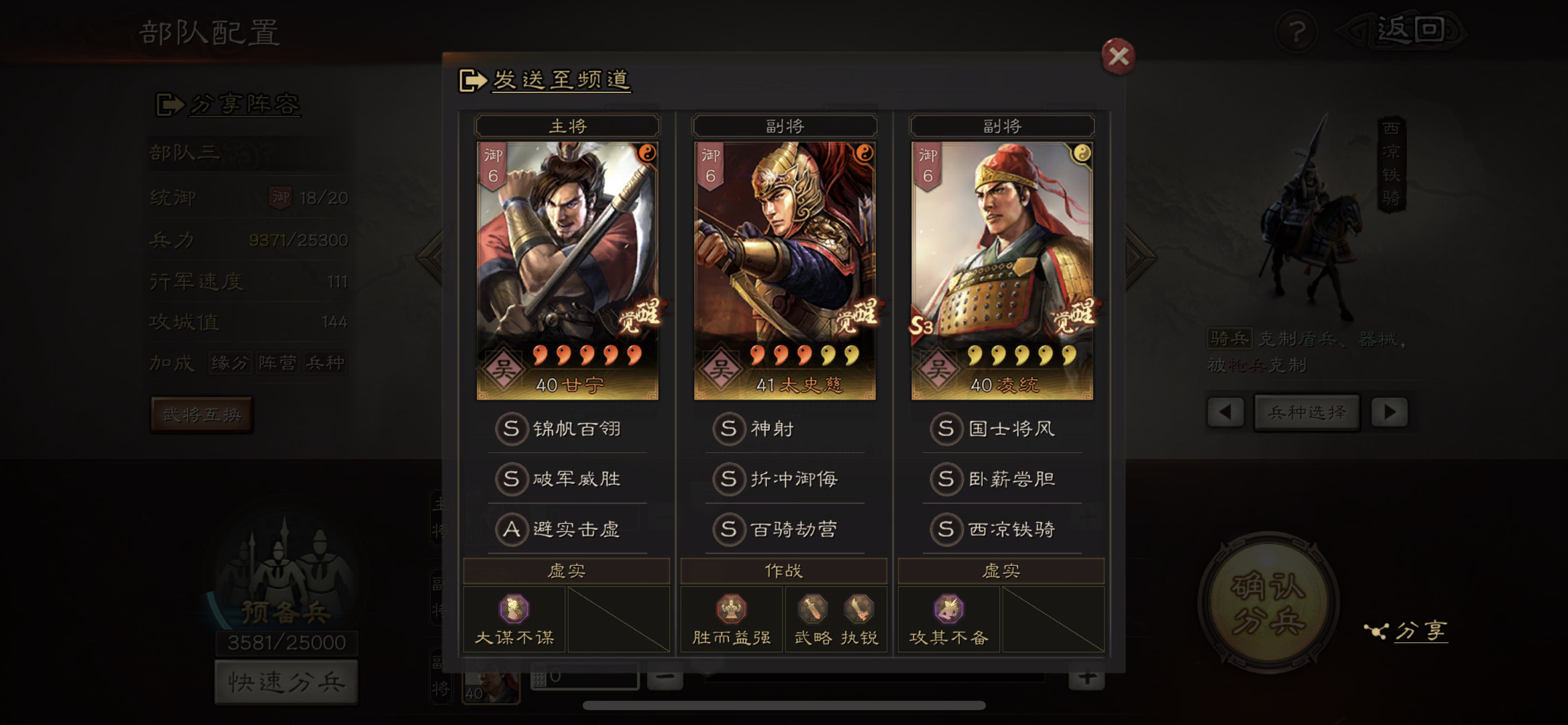 这个队伍由“夜色”投稿,玩骑兵不需要宝物,也可以玩盾兵。