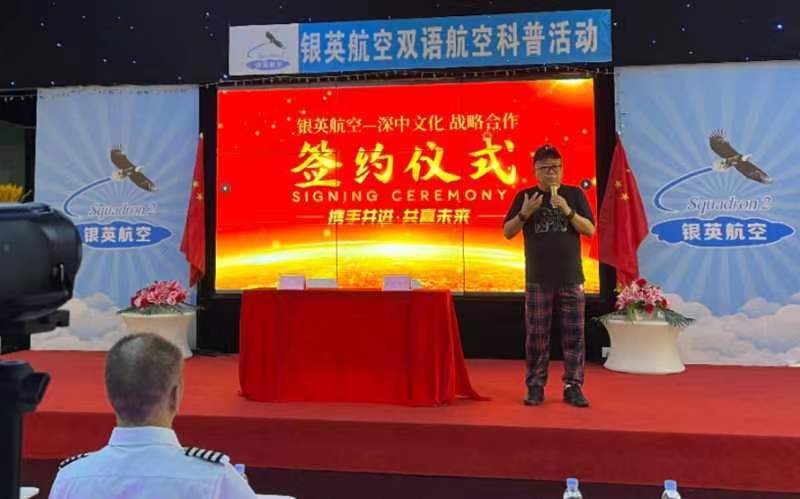 在昨天在签约仪式上,银英航空董事长陈总表示:中国的航空还比较落后,中国飞行员人才缺乏,飞行员素质有待提高,特别是双语能力有待提升,正是因为这个原因,陈董事长怀着对祖国航空事业的一份赤诚,2014年成立银英航空科普教育基地,为了孩子们的学习和模拟,他甚至买来国外一家航空学校作为培训示范。