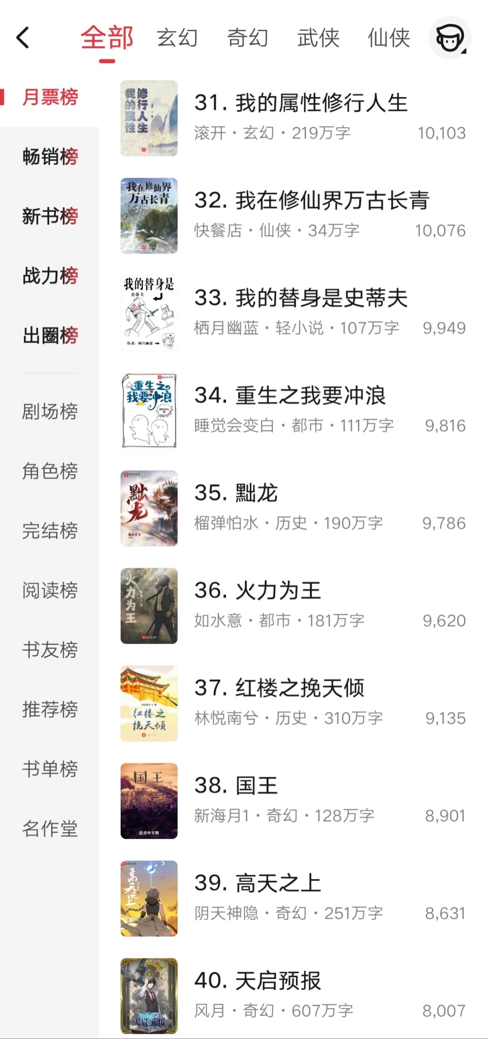 以上就是这一周部分作品的月票榜排名情况了,新规则之后总体还是向好的,但是对于超级读者、深度读者的监管方面有所漏洞。就是不知道起点接下来会怎么处理这方面的问题了。