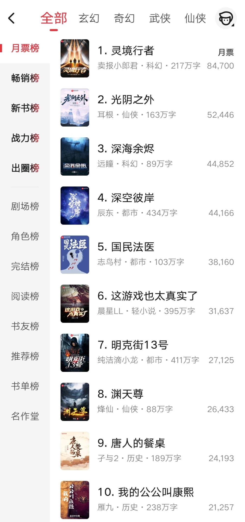 手机访问:wap.265xx.com1月第1周起点月票榜:双倍活动结束,灵境行者领跑,国民法医第五