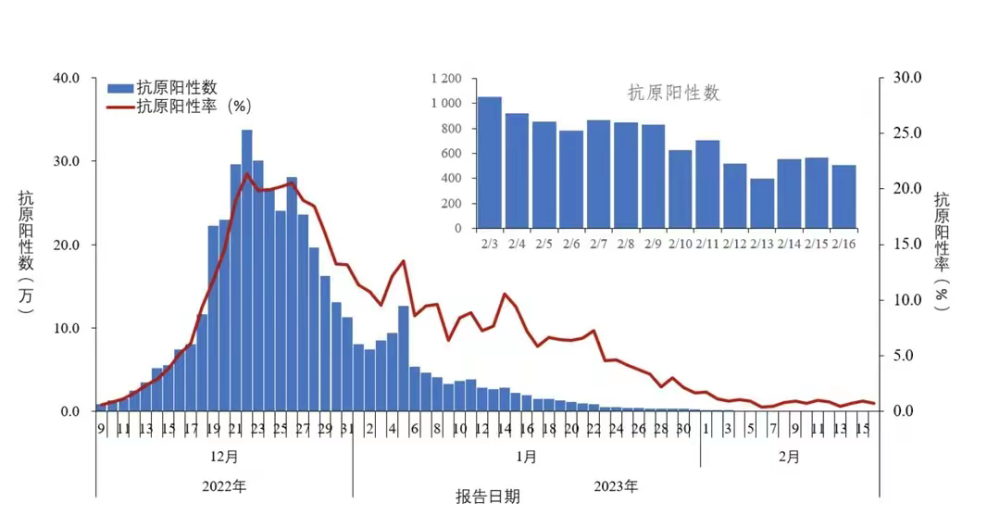 (上图为全国报告人群新型冠状病毒抗原检测阳性数及阳性率变化趋势/源自中疾控官网)