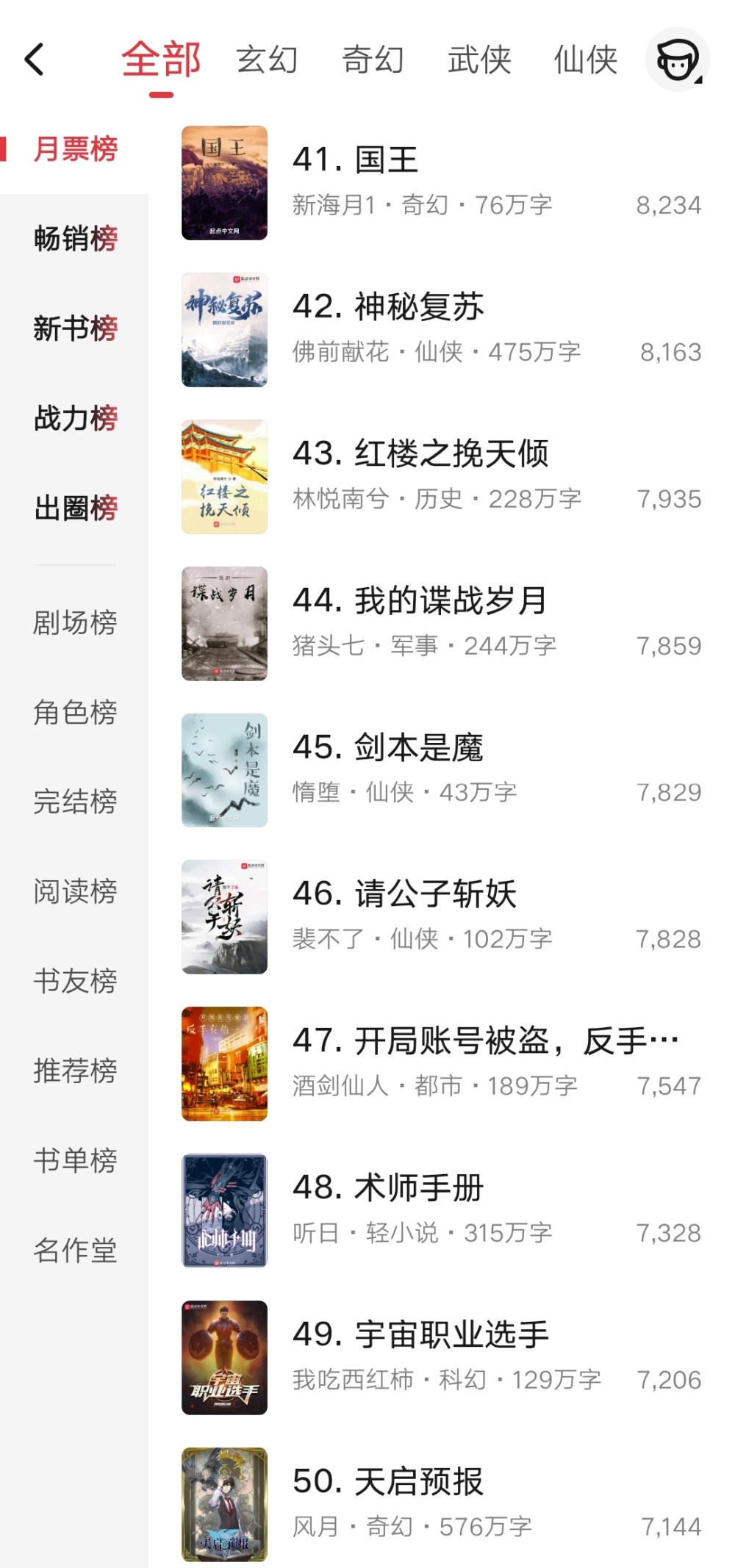 第四十一到五十名的十本小说,也还剩一本没有万订,就是惰堕的新书《剑本是魔》,小说本月上架的。