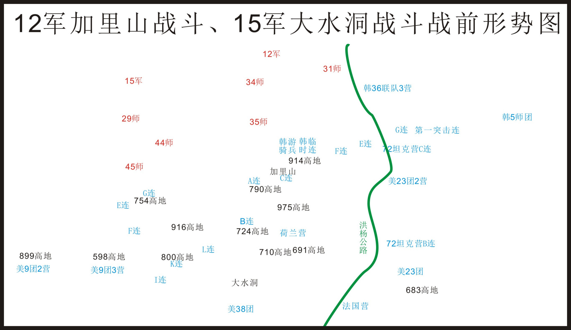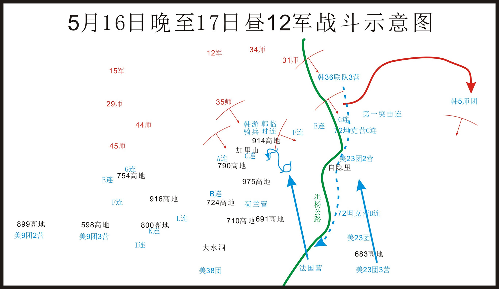 可是,实际上12军和15军的当面敌军为美军第2师,配属了法国营、荷兰营,韩军第36联队3营以及韩军一个游骑兵连和一个临时连。总兵力2万3千余人。