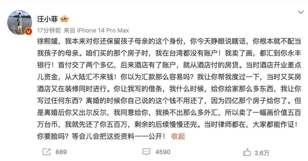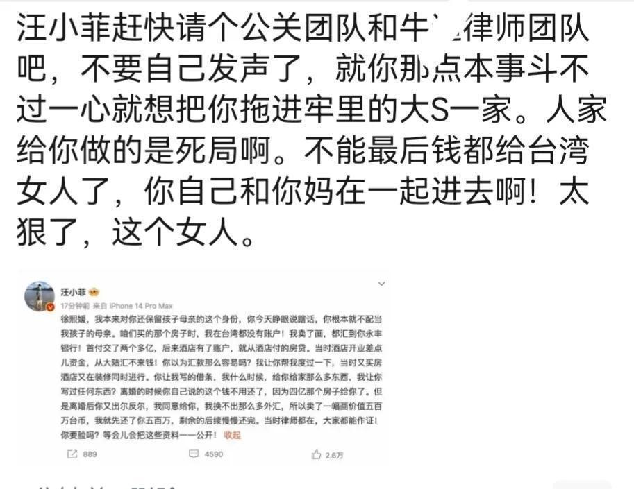 而在汪小菲的说法里,他为大S和这个家付出的所有,从来没有让前妻写下任何欠条儿。大S所说付的两套房子的首付款,那也是他从内地转账过去给前妻的。