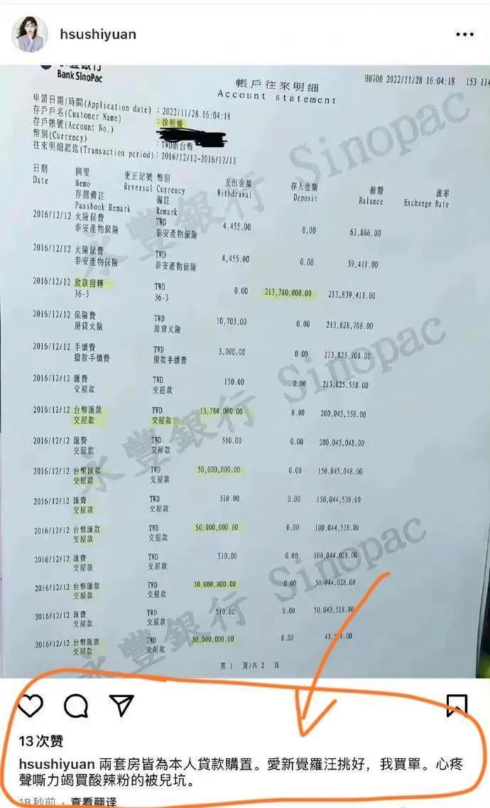 当天,大S晒出相关记录,证明在台北自己名下的两套房子,都是她本人向银行银行申请贷款的,并且付的首付款前后达三个多亿台币,合计也要几千万人民币。