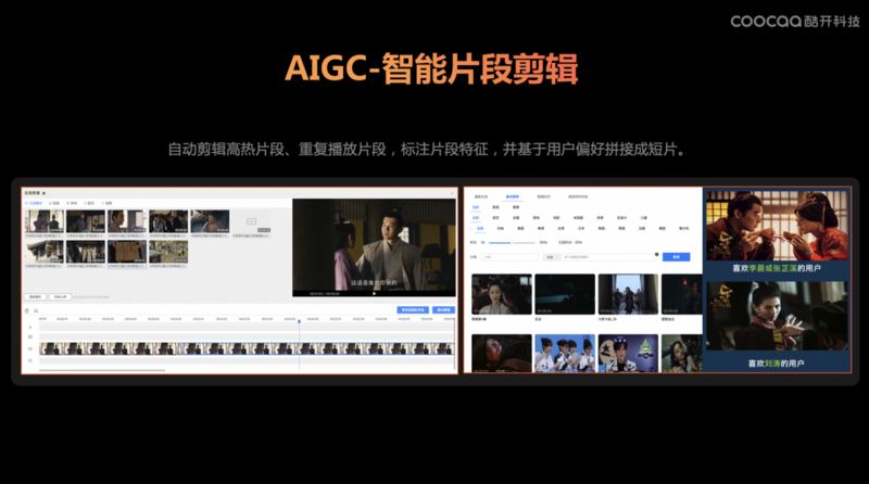 现在,大家看到整个瀑布流有更多的高能片段替代了海报,高能片段更容易吸引用户,让用户产生点击的冲动。千人千面的高能片段工作量是人工无法完成的,酷开科技有自动化的高能片段剪辑工具,可以根据用户喜好,自动剪辑和匹配个性化需求的高能片段。为了有效满足运营精准推荐、投放以及用户检索需求,可以提供音视频内容识别分析,按时间轴识别出视频中出现的物体、人脸、logo,通过语音、字幕识别出关键词,为每部剧集打上智能化标签。