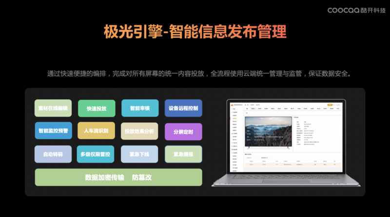 除了自动化运营,「极光引擎」智能信息发布管理产品,支持快速便捷编排、统一内容投放、数据加密传输、全流程云端管理和监控等,对保障数据安全也发挥着重要作用。