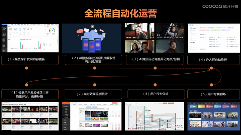 将以上所有的模块串联起来,形成全流程全自动化的运营链路。首先,媒资探针会自动发现内容的更新,其次同步AI服务会自动分析影片,截取优质片段和画面,AI算法将自动美化和生成海报,并且完成分人群的自动化推荐,形成每个用户的专属剧场。在用户观看推荐剧集后,运营后台会根据用户反应,修正内容质量评分与画像标签,形成实时效果监测并根据用户行为分析,重新调整分人群推荐策略,向用户进行新一轮更精准的媒资推荐。如此往复,使推荐变得更精准。