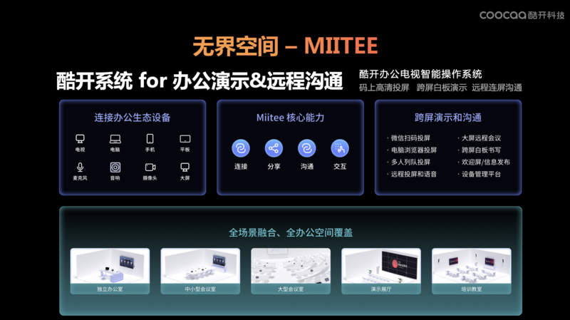 针对商用场景推出了Miitee OS,为企业办公演示和远程沟通提供了高效场景解决方案。无论是码上高清投屏、跨屏白板演示,还是远程连屏沟通,通过多项技术革新,我们真正做到了极快、极稳、极好用。