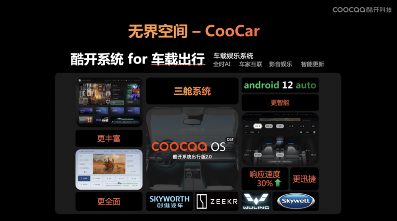 在车载场景上,酷开系统出行版将优秀的家庭娱乐功能延伸到汽车上,提供了内容丰富的三舱娱乐系统,全时AI语音让我们解放双手,感受科技带来的全新驾驶体验。同时也能车家互联,将观影记录从室内延续到出行的全过程。目前这套系统已经服务了包括创维汽车、极氪、五菱等多个车型。