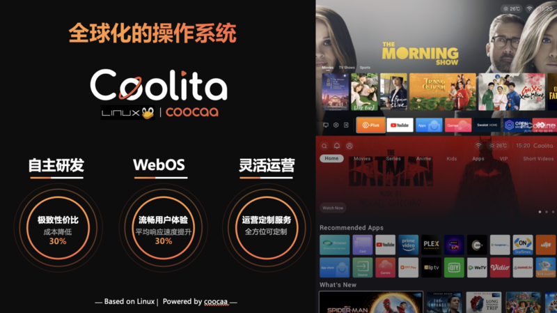 酷开科技在国内深耕同时,也将国内多年积累的经验和技术运用于海外市场。面向海外市场推出了全球化的操作系统——Coolita OS。Coolita OS是一款完全自主研发的,基于linux的Web OS。向合作伙伴提供了极致性价比、简单易用、可快速定制的智能化大屏系统解决方案。
