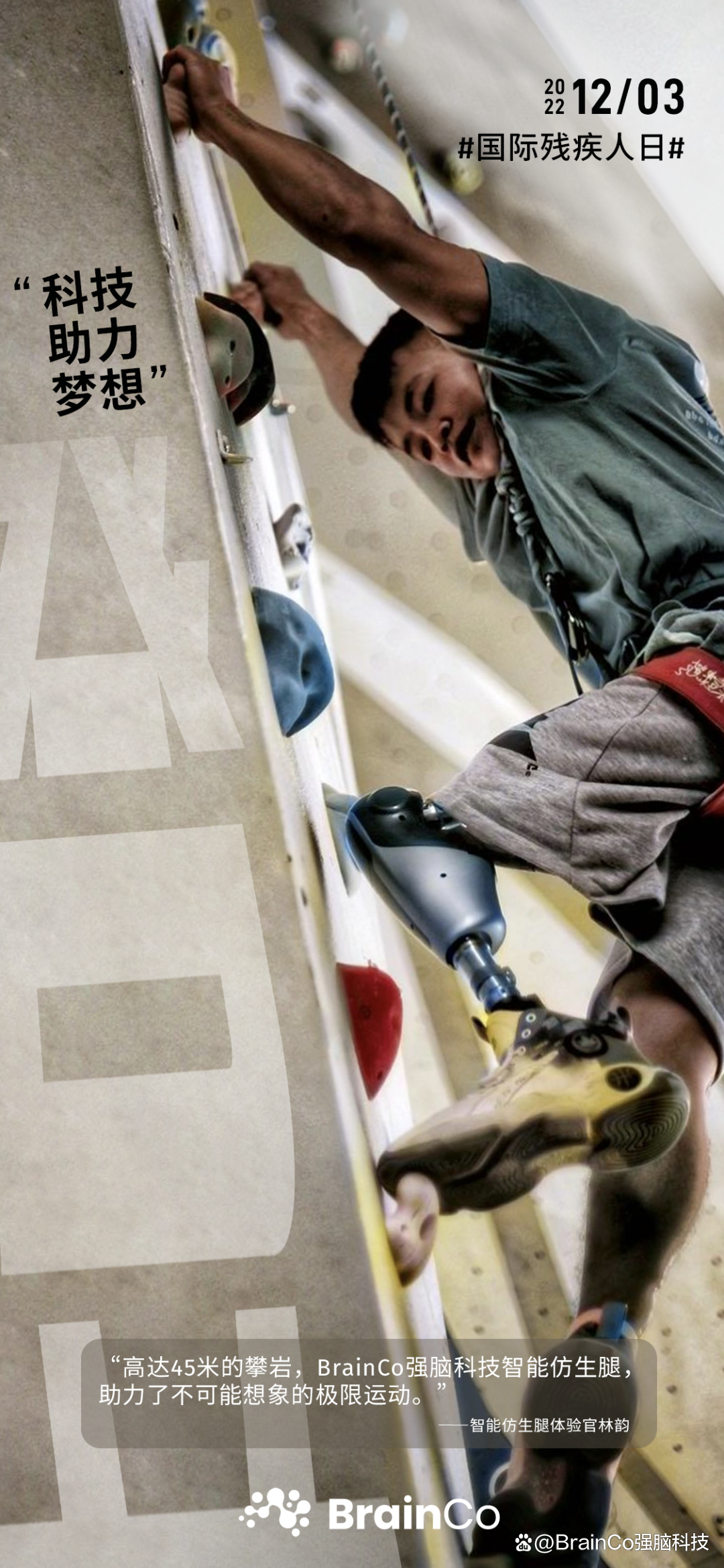 BrainCo强脑科技2022年度发布会上,在万科主席王石的见证下,林韵在智能仿生腿的帮助下,完成了高达45米的攀岩,仿生腿带给我们的科技力量着实令人惊叹,但同时,我们也看到了一位自强不息的青年,坚定信念和理想,在仿生腿的助力下勇攀高峰,收获了不一样的人生。在未来,他想借助这只“神奇的腿”,尝试更多之前不可能想象的极限运动。