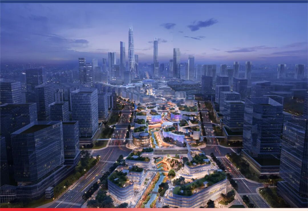 永安渠创意水景贯穿中轴,构成独一无二的滨水文旅商业街景。蜿蜒渠水,将低密度文旅商业街楼群与不远处未来之瞳的超高层楼宇串联起来,形成错落有致的现代城市山水,灵动的城市天际线。
