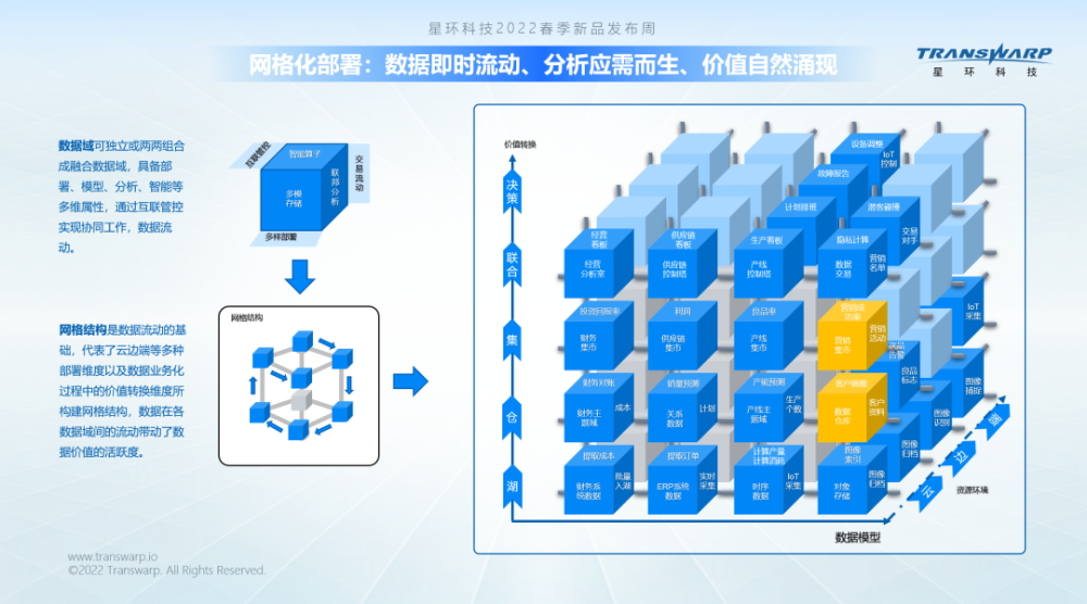 对于融合数据云而言,数据将被存储于多模型的数据库中,并且以网络结构的方式部署和流动。数据域可独立或两两组合成融合数据域,具备部署、模型、分析、智能等多维属性,通过互联管控实现协同工作,数据流动。网格结构是数据流动的基础,代表了云边端等多种部署维度以及数据业务化过程中的价值转换维度所构建网格结构,数据在各数据域间的流动带动了数据价值的活跃度。企业可以根据云边端等数据资源环境、时序/对象/图片/文档/图数据等企业数据模型、湖仓集等存储结构建立三维立体的数据域,并形成企业级的网格结构,为数据的流通创造合规的路径和价值创造的前提基础。在融合数据云下的数据,能够在不同的数据平台间即时流动,数据流从低到高,为企业不断涌现数据价值,而从高到低,又为企业的分析应用部署,提供了应需而生的响应速度。