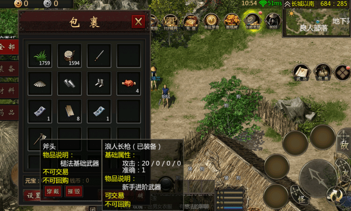 2、装备斧头(打开自己的包裹并装备上斧头)