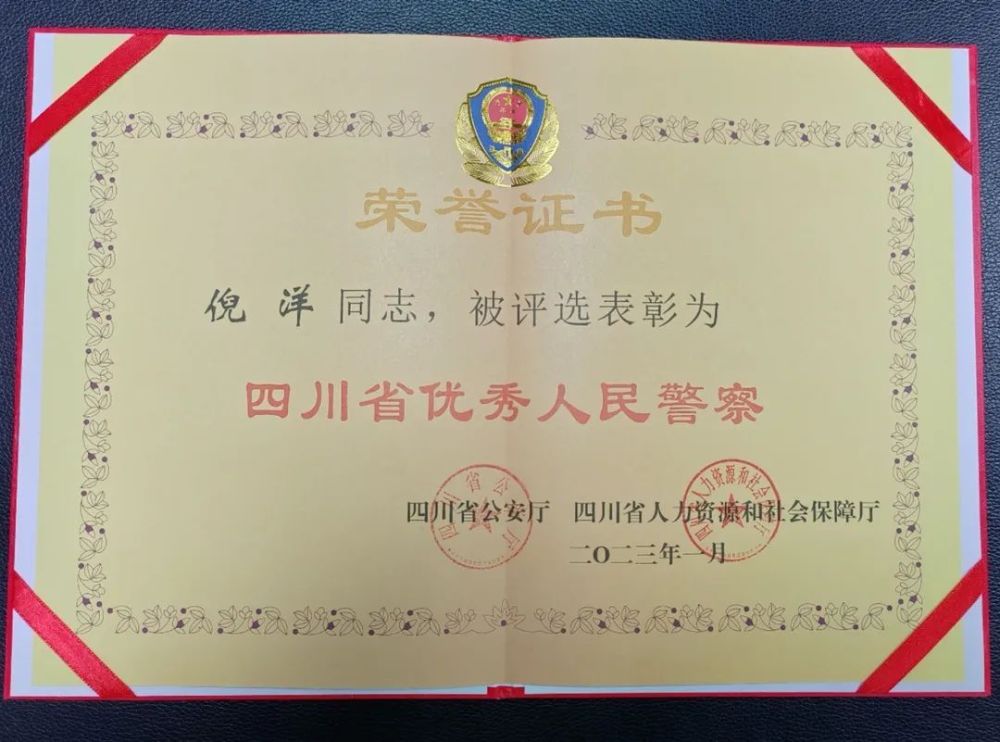 近日,四川省公安厅为表彰先进,弘扬正气,激发全省各级公安机关和广大公安民警奋进动力,立足本职创先争优,联合四川省人力资源和社会保障厅发布《关于表彰四川省公安系统优秀单位优秀人民警察的决定》,其中我局倪洋同志被授予“四川省优秀人民警察”称号。