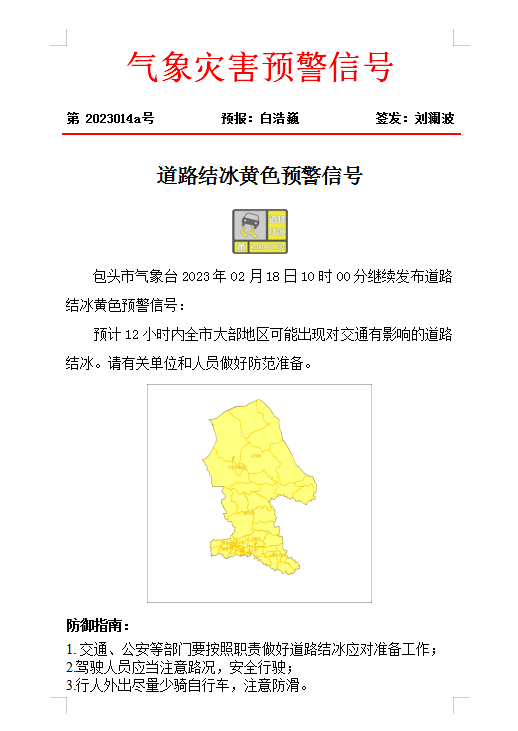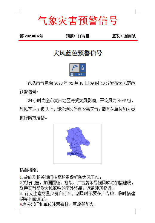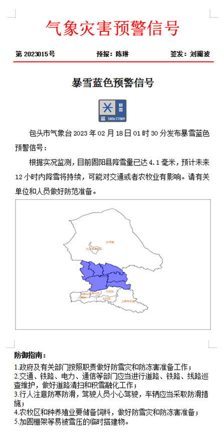 包头市气象局2023年2月18日07时发布天气实况:17日22时开始,包头市出现降雪天气,最大降雪量出现在希拉穆仁为 7.3 毫米。各旗(县、区)降雪量(毫米)为:市区2.4,土默特右旗3.7,固阳县5.5,白云鄂博 1.5,百灵庙3.3,希拉穆仁7.3,满都拉1.9。
