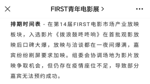 凭借“要命的真实”、对社会议题的探讨及人文关怀,《拨浪鼓》曾提名上海国际电影节亚洲新人奖最佳影片奖,也曾在FIRST青年电影展一票难求、北京国际电影节、丝绸之路国际电影节等节展亮相,并被评为第6届迷影精神赏“华语新电影十佳”。
