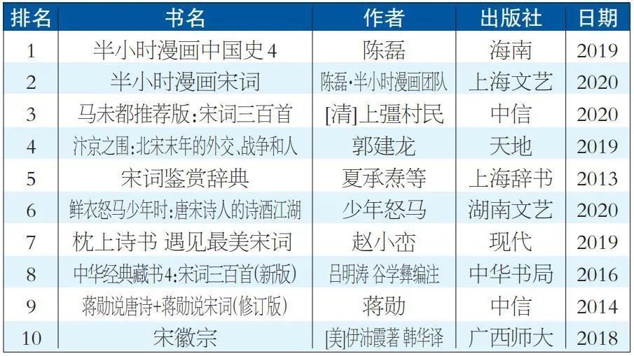 我们做了一个调查,以“宋”为关键词,列出近2年来某电商平台销量最多的图书(排除童书类)。可以看到,宋词这一中国古典文学深入人心,无论是对宋词的赏析还是解读,前10名占据了7席。剩下两席一头一尾,位列榜首的是以幽默著称的历史漫画读本《半小时漫画史4》,第10名是美国历史学家伊沛霞积数十年之力撰成的《宋徽宗》。(见表1,这一榜单虽无法精准反映宋朝如金庸作品和《水浒传》的受欢迎程度,但亦能大致勾勒宋朝文化之受欢迎面貌)