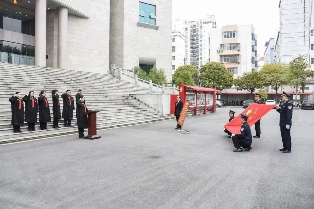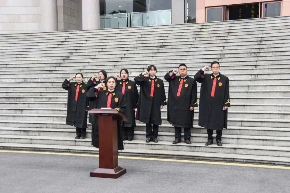 3月2日,百色中院举行新任审判员宣誓仪式,院党组成员、政治部主任杨顺杰监誓,7名新任审判员右手举拳,面对国旗庄严宣誓。