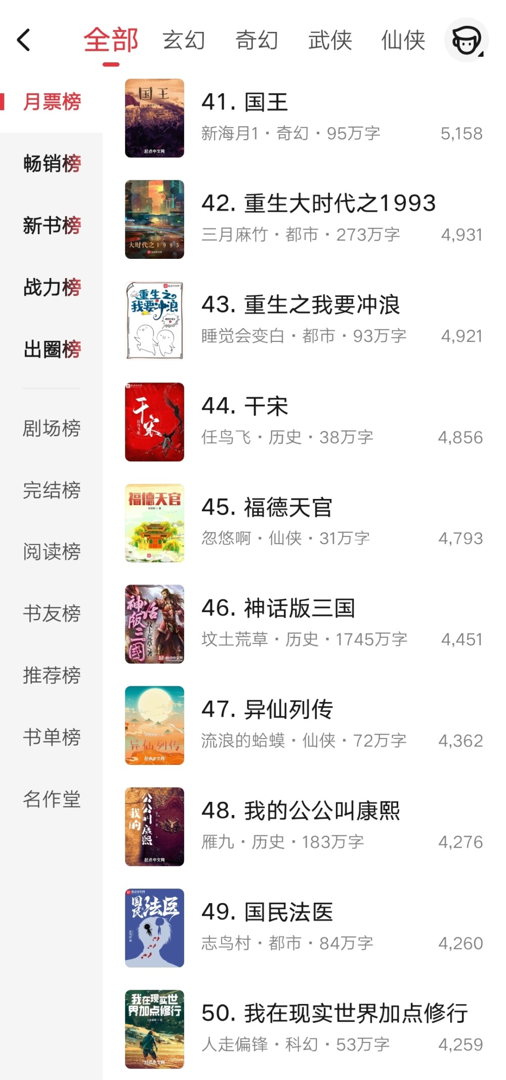 第四十一到五十名里还没有万订的小说就多了起来,有四本了。