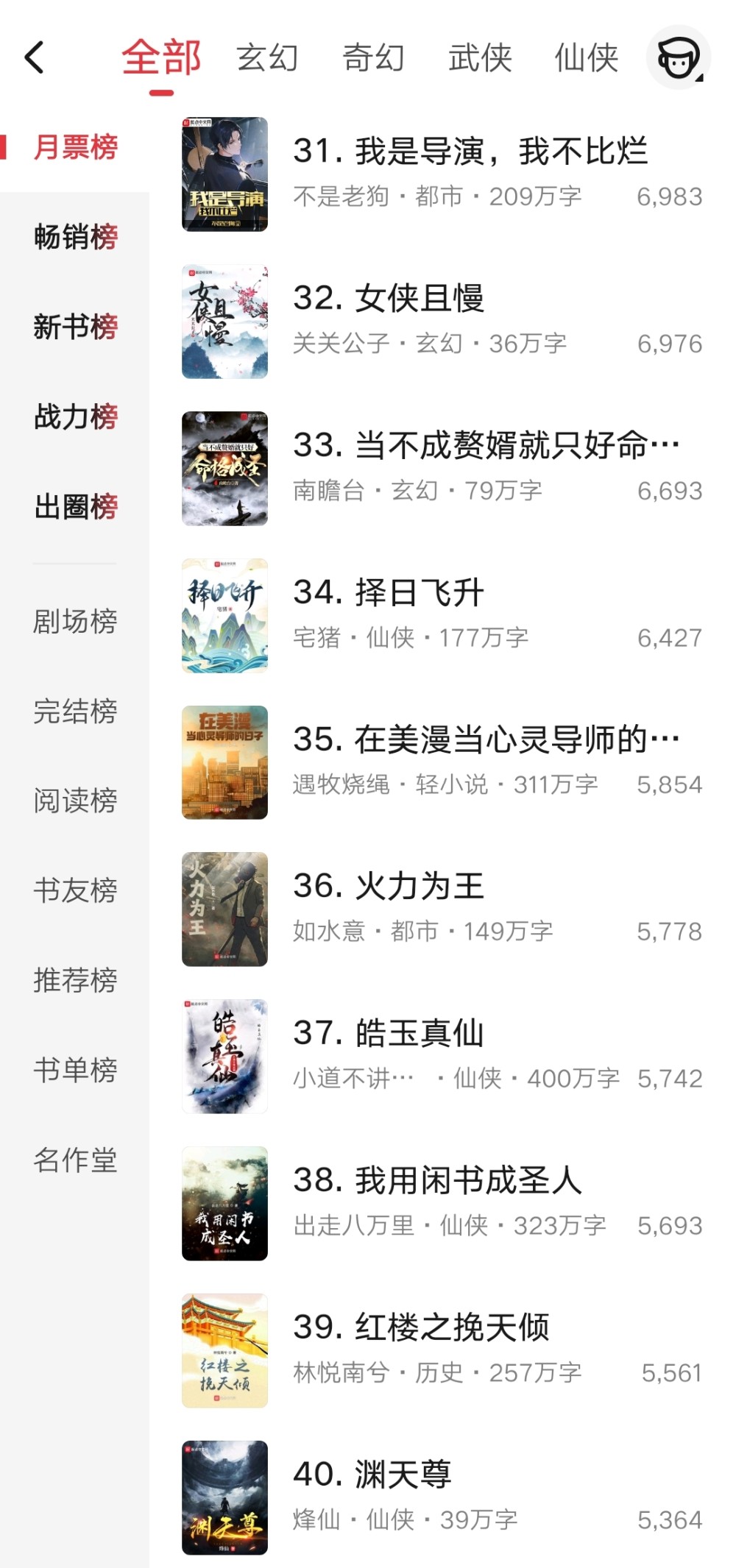 第31到第40名的小说就剩最后的《渊天尊》还不是万订成绩,本月这本小说上架打榜的。