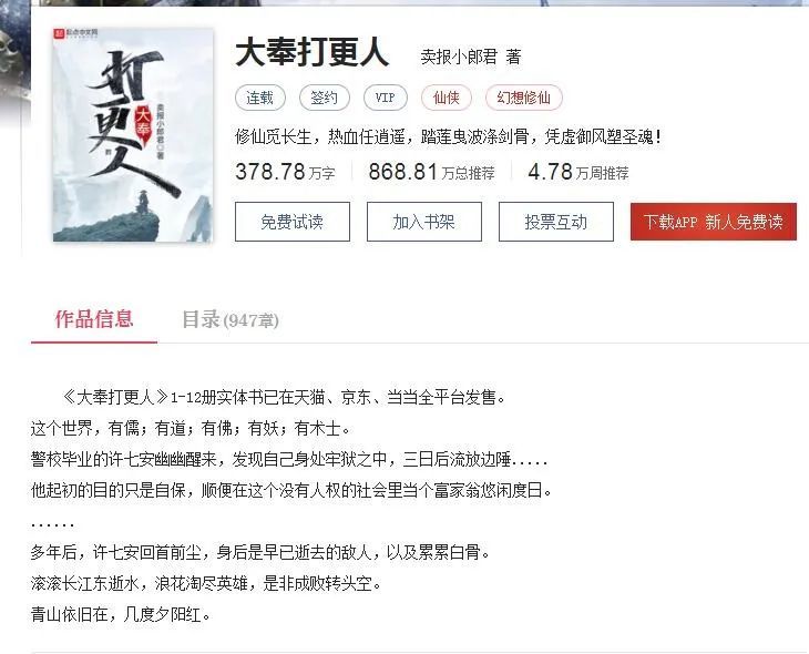 配合起点的完结活动,卖报的小郎君,在2021年8月5日完结了《大奉打更人》本书字数锁定在378.78万字,是否完结,写的依然是“连载”。