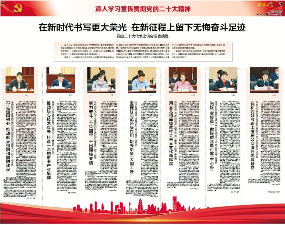 座谈会上,中国航天科技集团有限公司第四研究院党委副书记、院长任全彬,陕西汽车控股集团有限公司党委书记、董事长袁宏明,中航西安飞机工业集团有限公司党委委员、铆工薛莹,中国兵器西北工业集团钳工高级技师张新停, 西安易俗社有限公司党支部书记、执行董事、总经理惠敏莉,莲湖区桃园路街道劳动一坊社区党委书记、居委会主任周建玲,西安市公共交通集团有限公司第三分公司驾驶员法晓芳等七位党的二十大代表,谈感受,谈体会,结合工作实际谈贯彻落实打算。