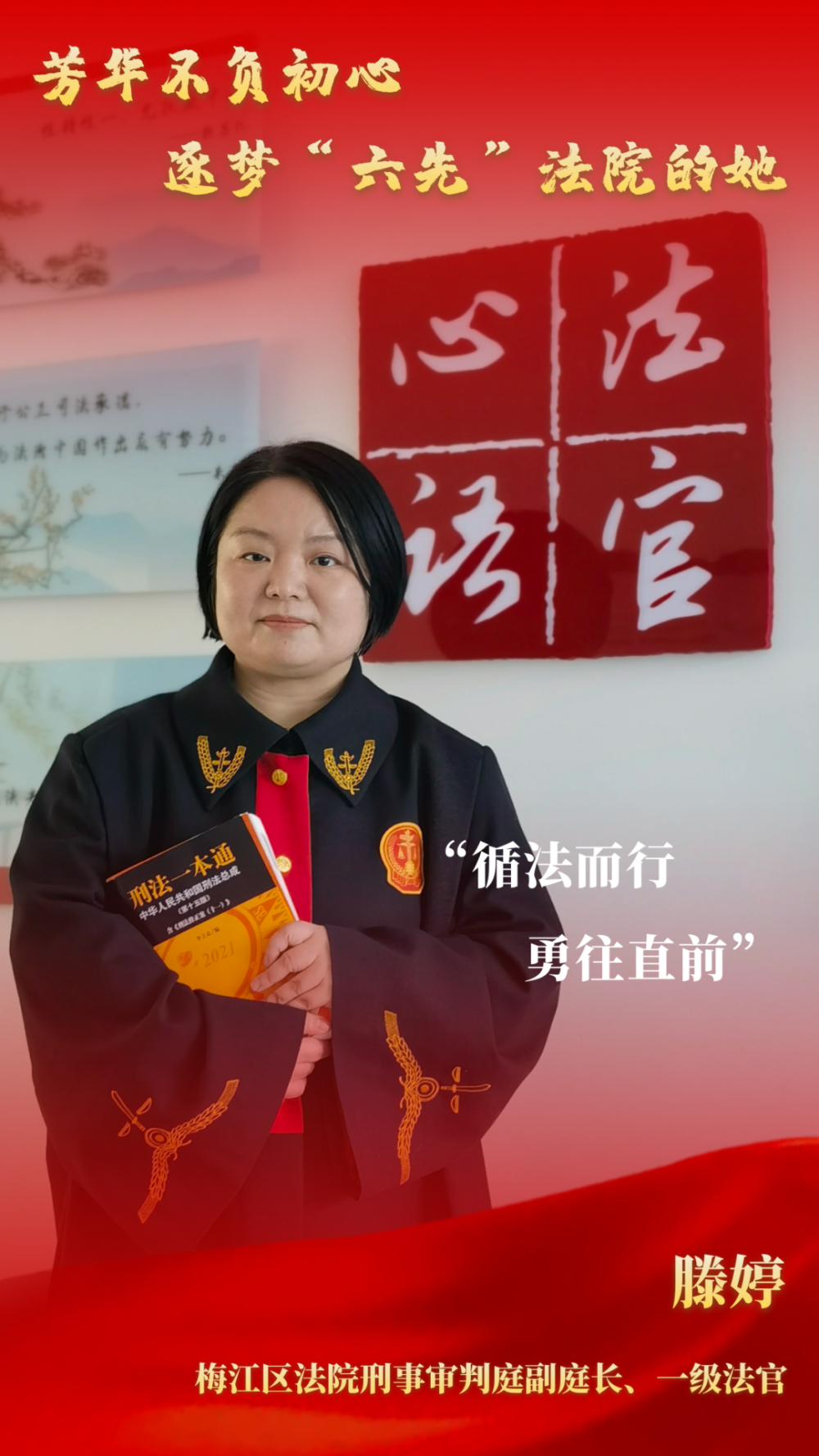 作为一名刑事审判法官,在罪犯面前以“刚”的一面,维护法律的神圣与尊严。面对未成年人罪犯,我以女性特有的耐心和细心,寓情于法,感化教育,以“柔”的一面传递司法温暖。法官之路实属不易,而法官之心实该坚守。在未来的道路上,我会用行动诠释对法律工作的热爱,一路向阳,追逐正义!