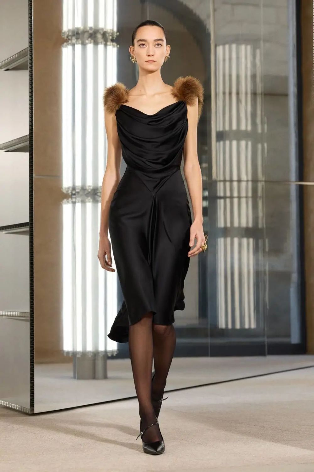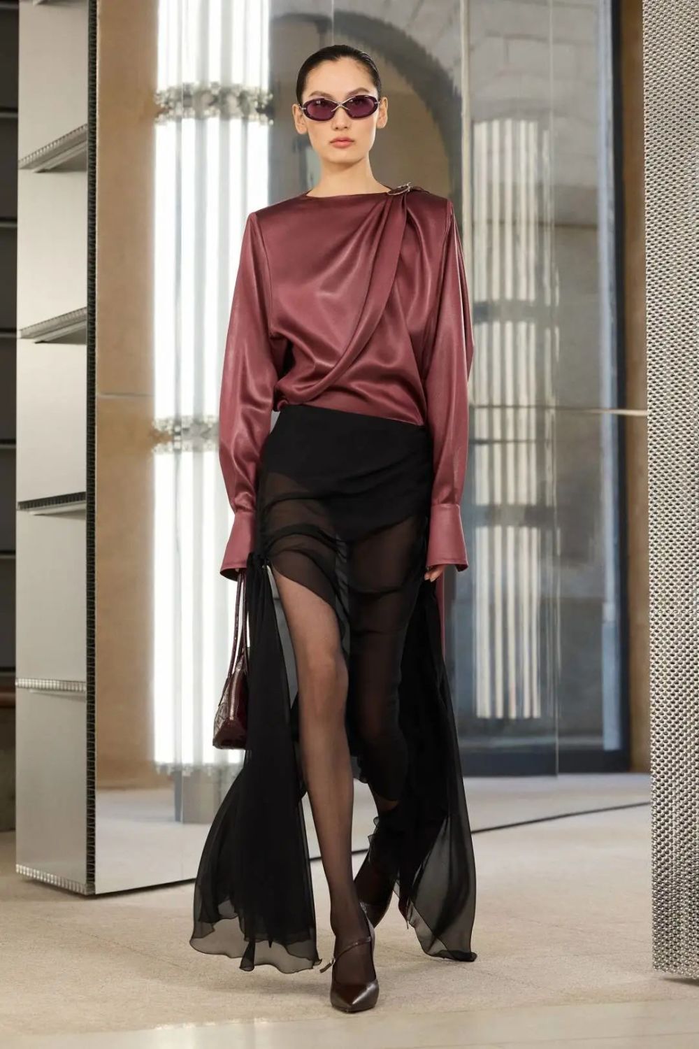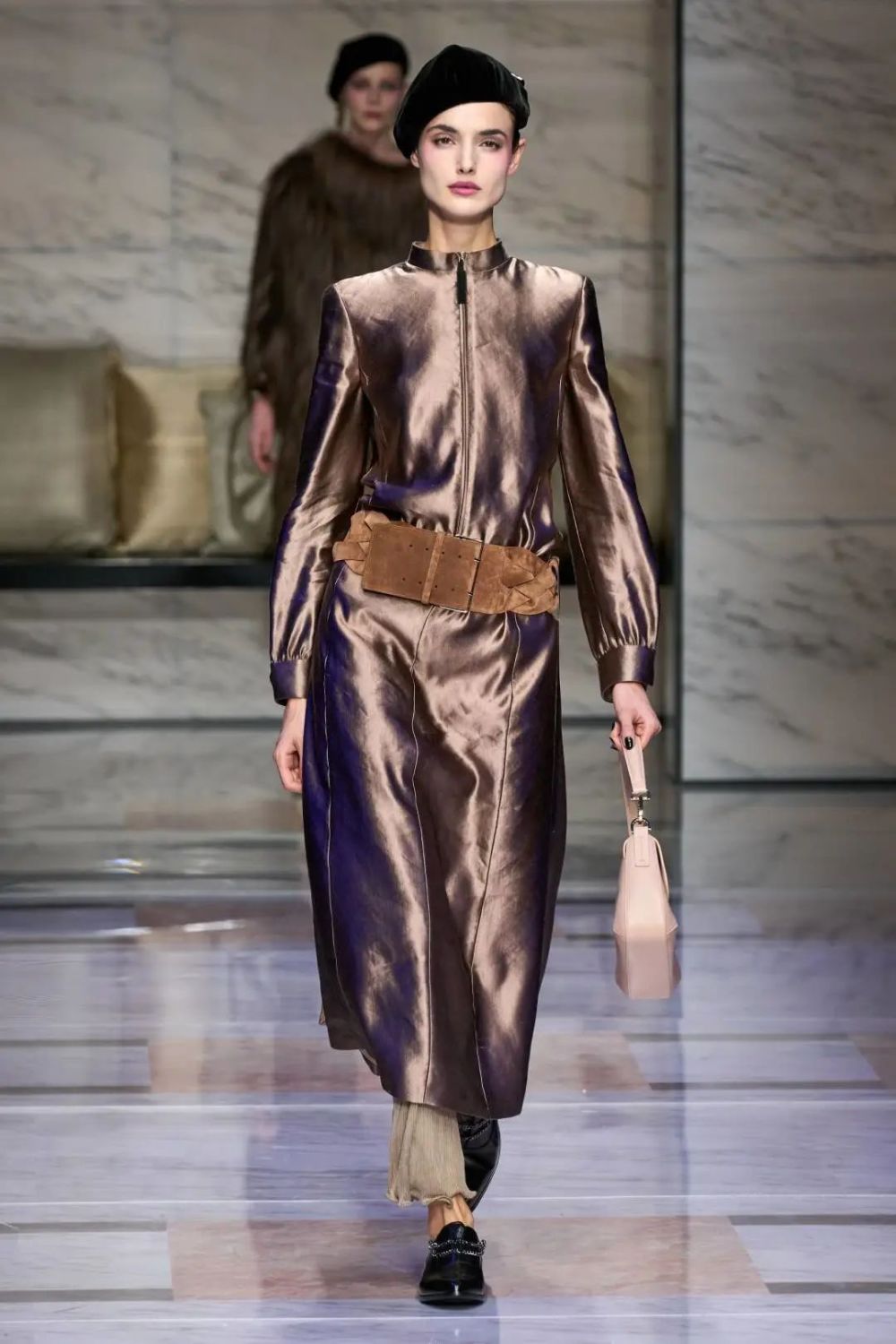 服装廓形充满流动性:丝质连衣裙、裹身披肩、柔和裤装、套头衫、修长夹克与长款连衣裙,游走于大地色、粉色、橘色、青铜色等多变色调之中,如彩妆盘一般。