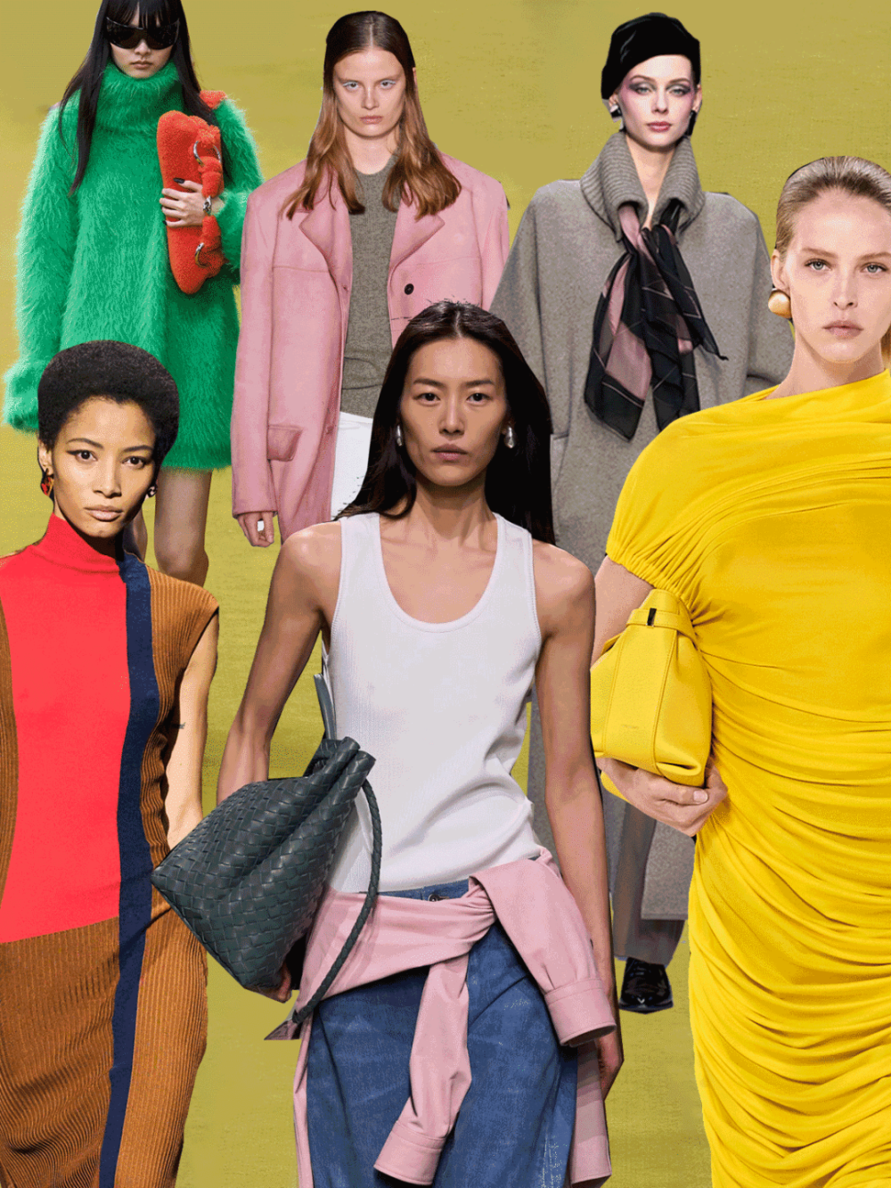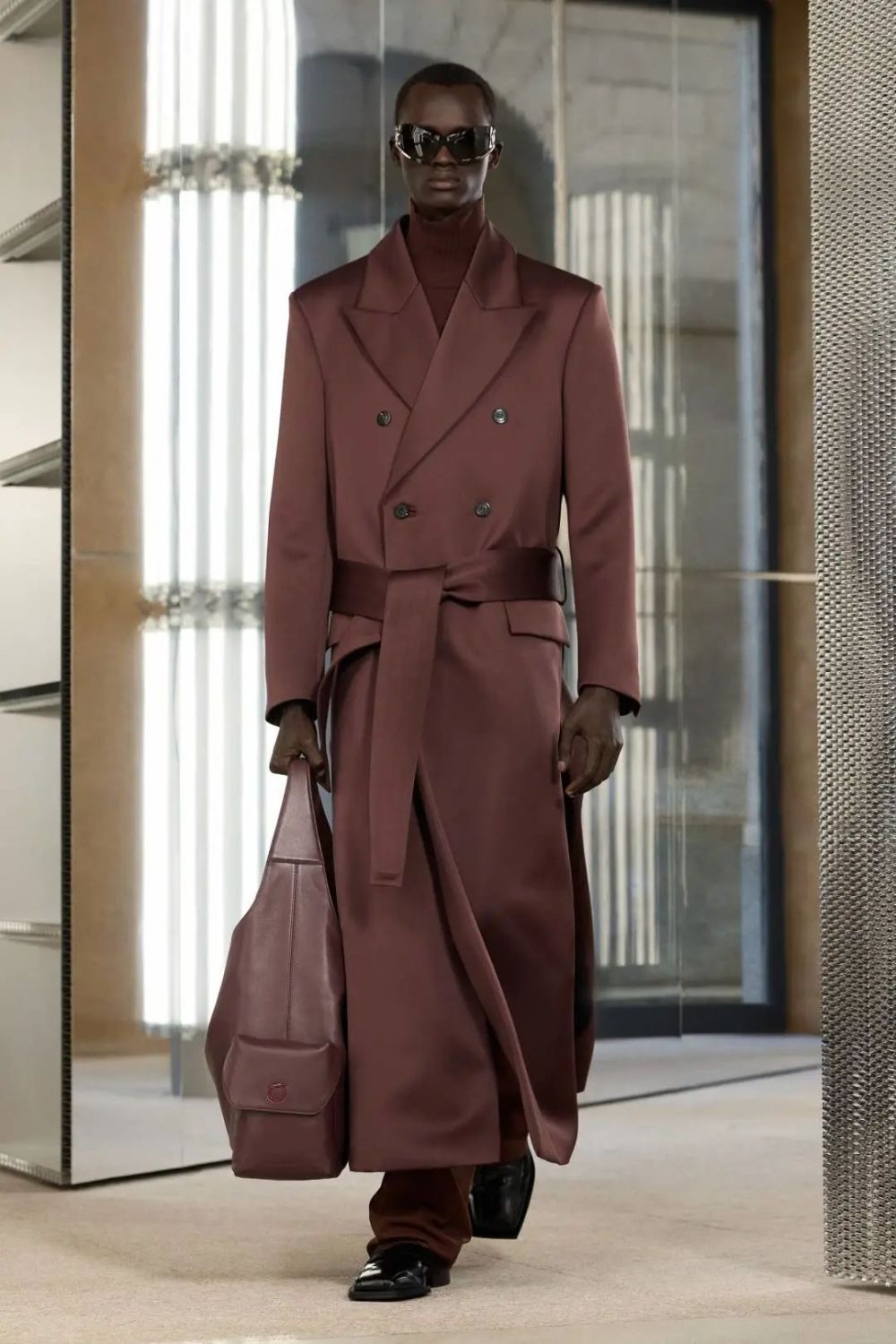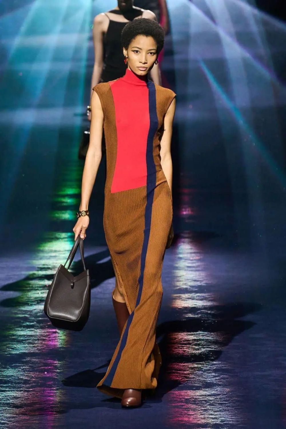 服装廓形充满流动性:丝质连衣裙、裹身披肩、柔和裤装、套头衫、修长夹克与长款连衣裙,游走于大地色、粉色、橘色、青铜色等多变色调之中,如彩妆盘一般。