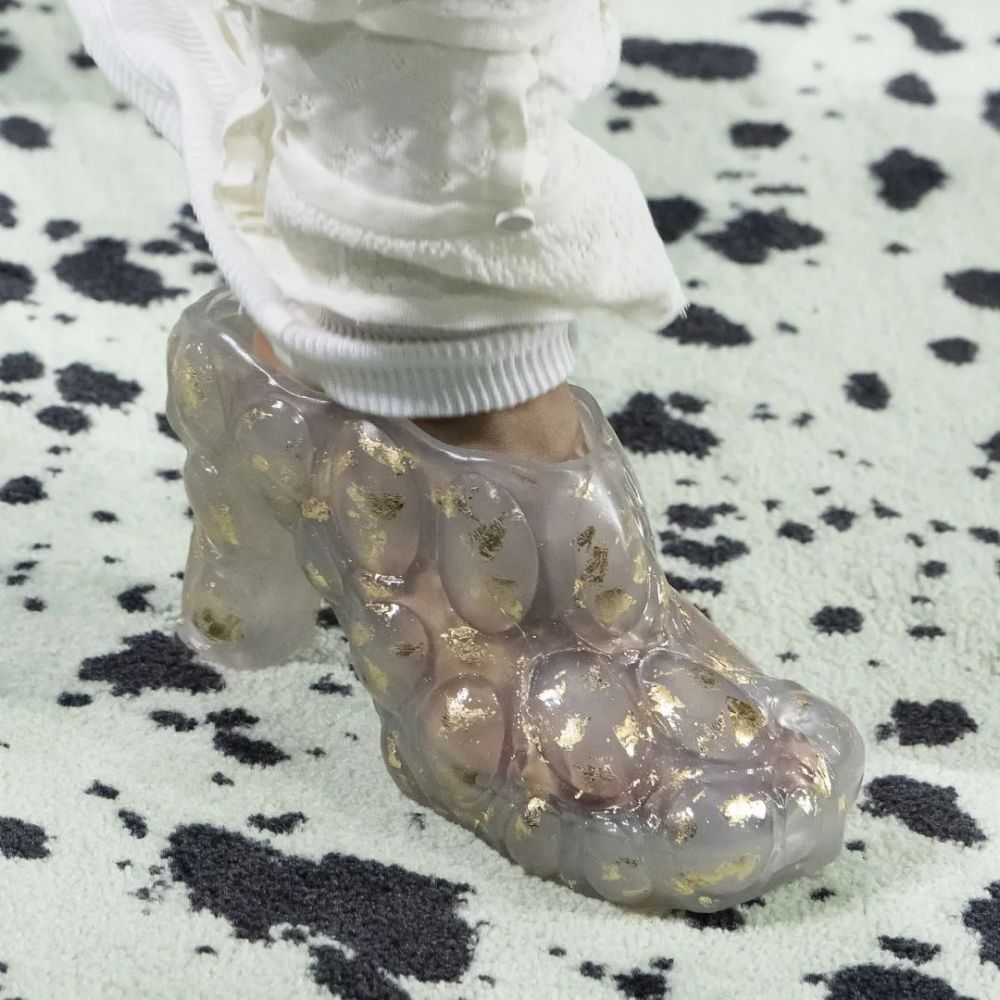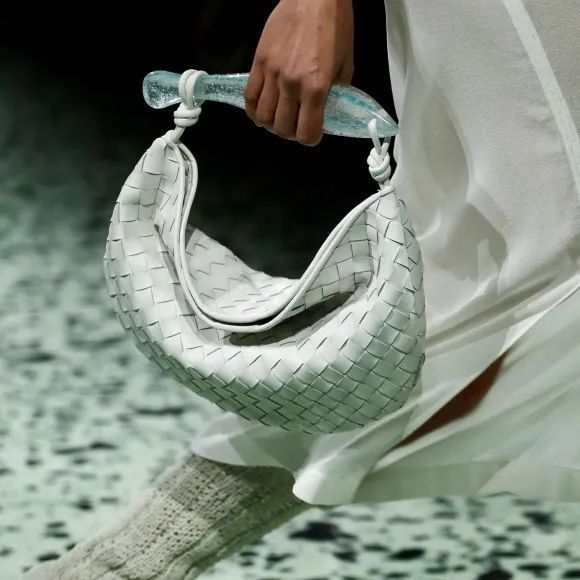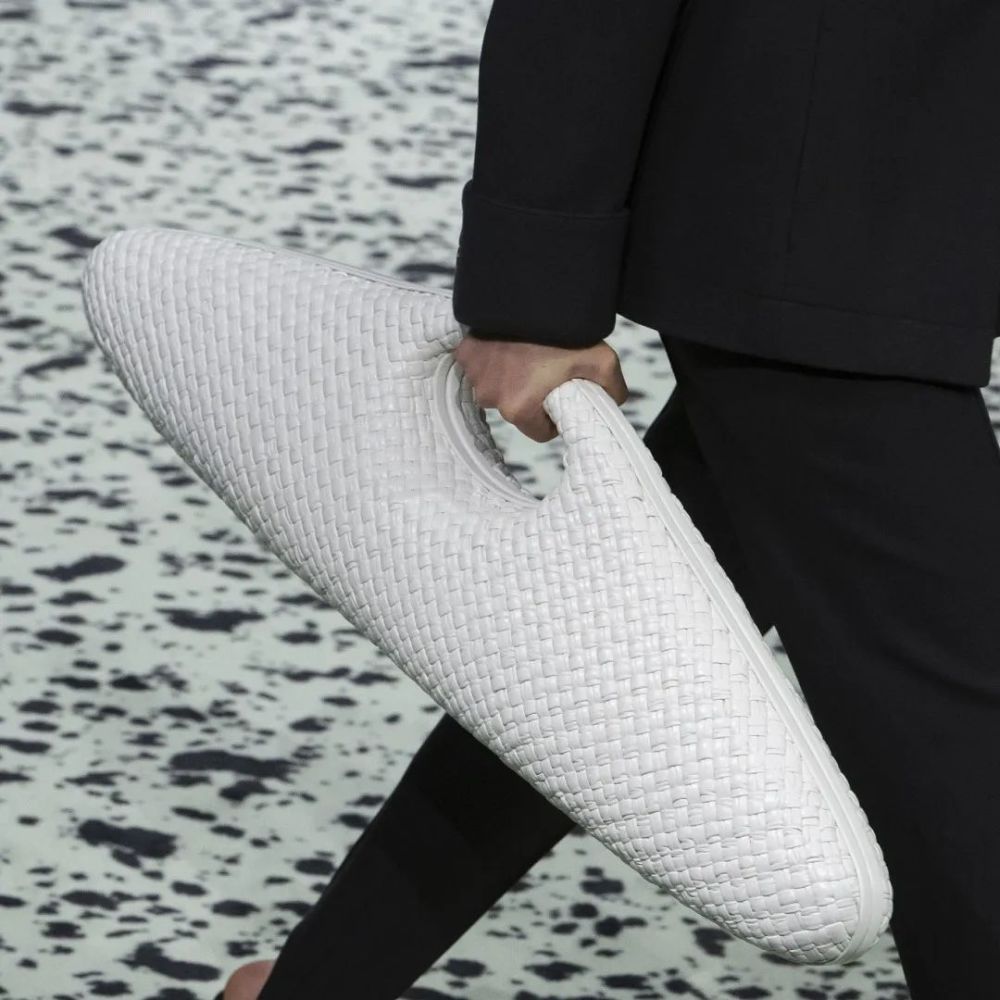 “拟态”建立了 Bottega Veneta 的新宇宙。在这个宇宙里,时装颠覆了肉眼可辨的“价值”:看起来平价的单品在工艺上可能极度复杂昂贵(如看起来像棉布睡衣一样的皮革衬衫套装、如针织袜的皮靴),而那些 Sardine 手袋上宛如珠宝的把手只是 Murano 玻璃。Bottega Veneta 的价值不来自于“被看”。