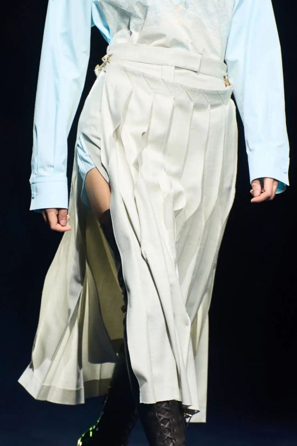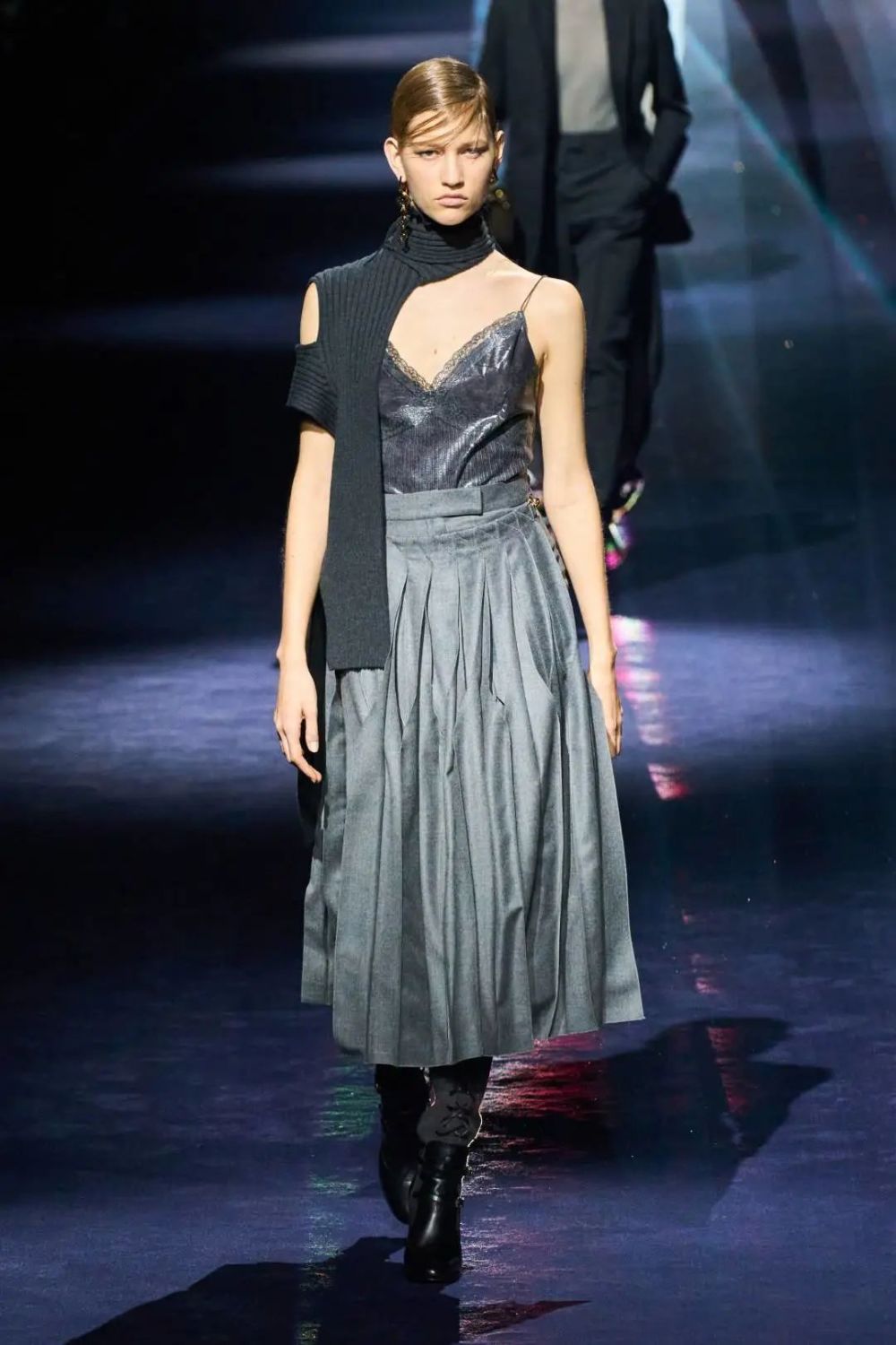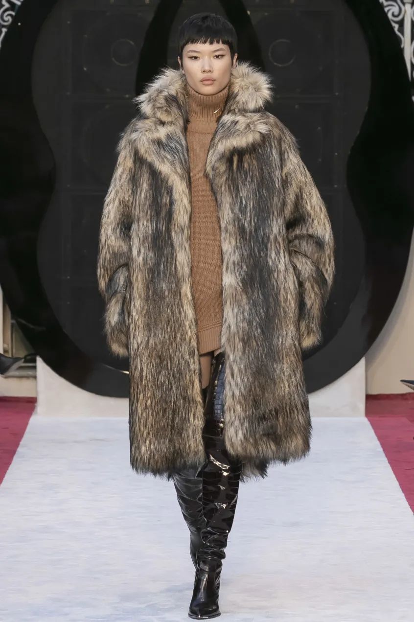 实用主义贯穿始终,剪裁利落的雨披装饰有长而深的衩口;非对称剪裁的垂褶连衣裙或波斯羔羊皮背心用绑带的形式固定;朋克风格的针织衫呈现切口整齐的裂缝;罗纹针织衫解开纽扣斜搭在肩上;褶皱形式的缎布连衣裙搭配波浪造型的的围巾,浪漫奔放。