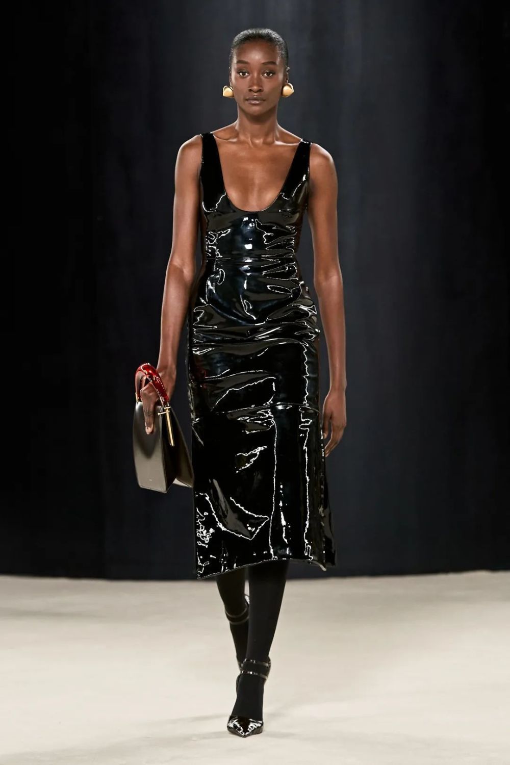 比如,这个系列借鉴自艺术家 Lucio Fontana 《空间概念》系列作品的刀割元素,在衣服上隐藏一线亮色,再比如包袋和首饰上流线型的树脂元素,以及金银线迷你裙、漆皮裙装……
