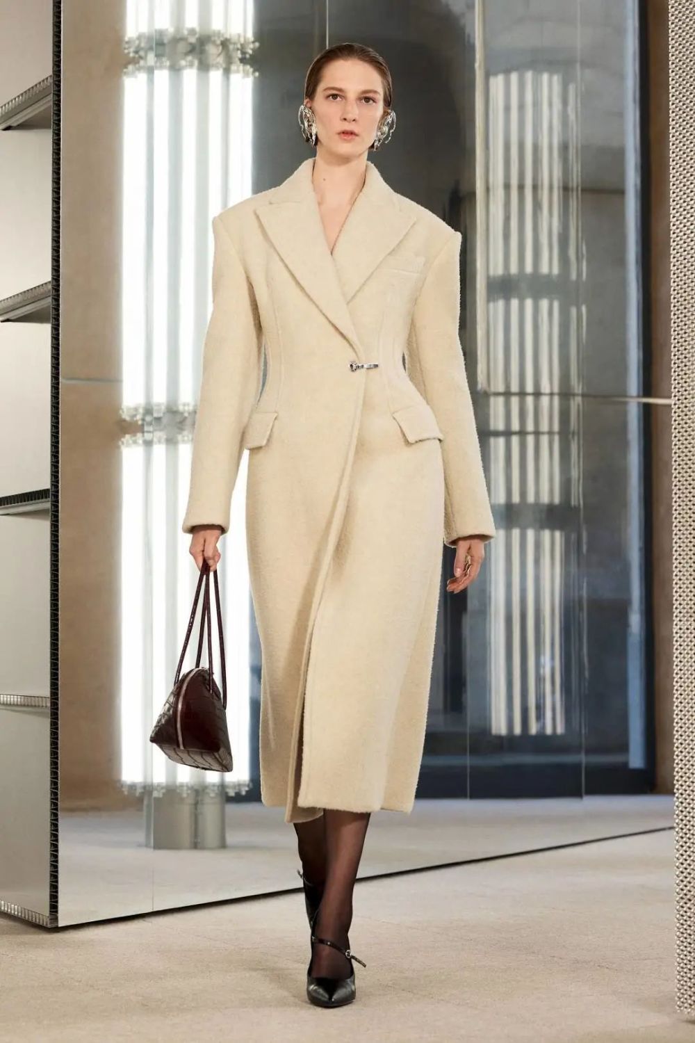 Max Mara 从这些衣着考究的人物中采撷灵感:身穿柔软外套、侃侃而谈的绅士,衣着整洁、头系黑色缎带的公证员,肩披斗篷或以单肩披挂大衣的文雅军官,或是穿着时髦大斗篷的傲慢公爵。于理性与秩序的严密剪裁结构设计中融入一丝浪漫的气息。