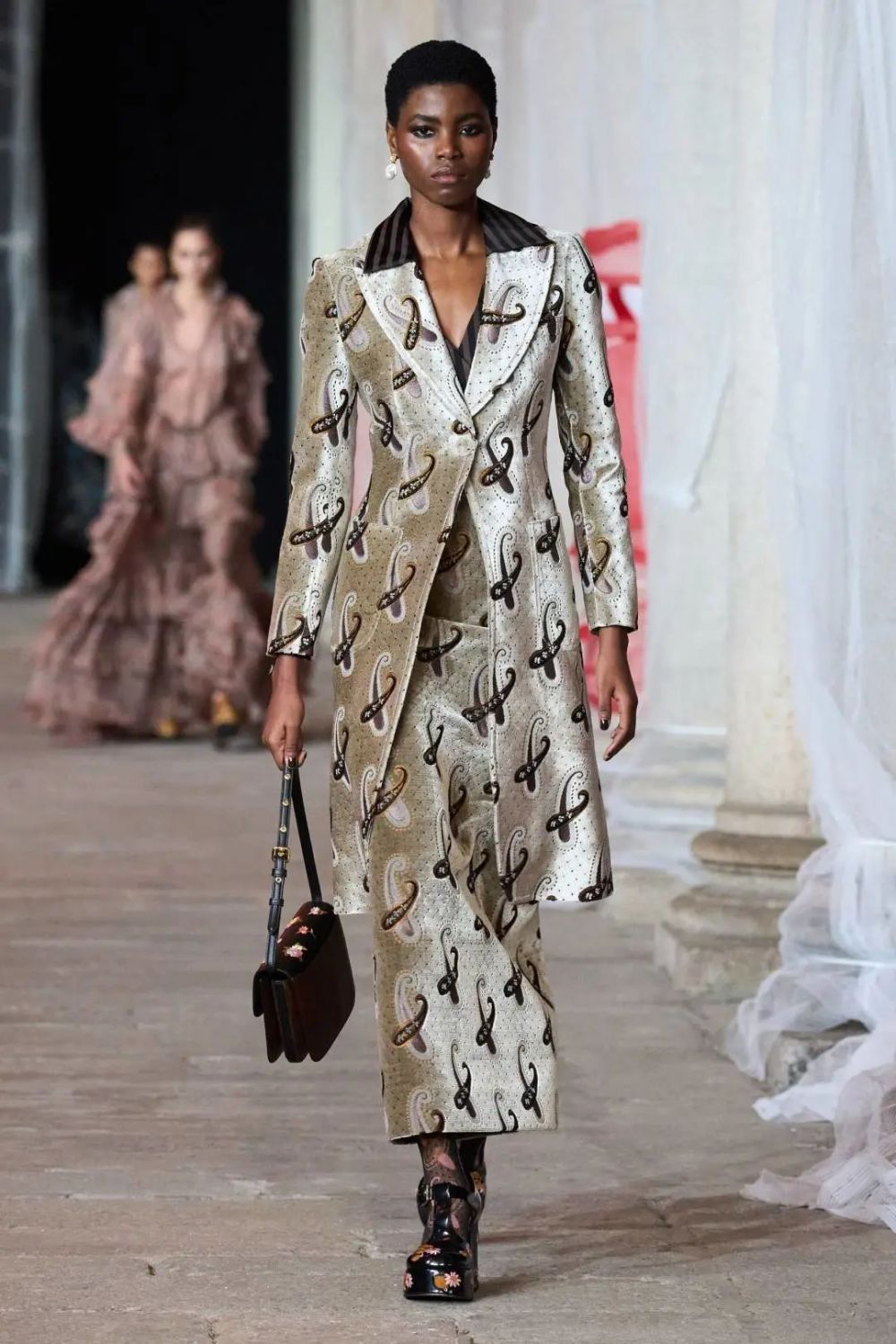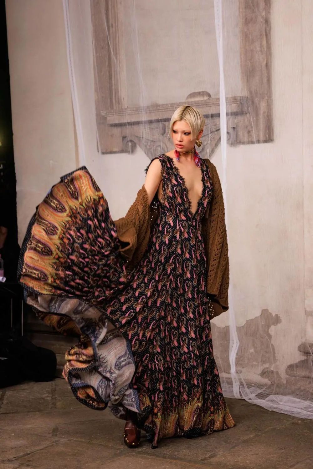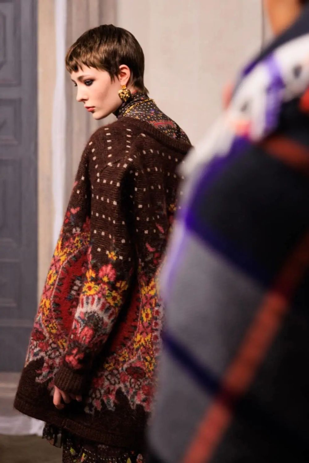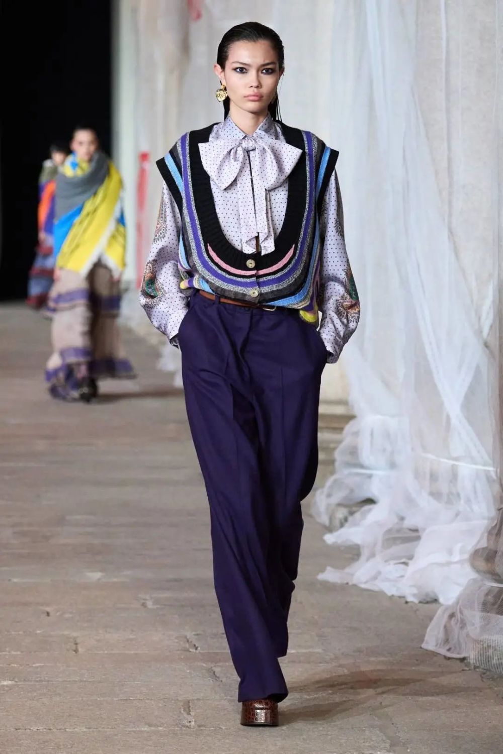 这是一场革新之旅。这个品牌经典的苏格兰格纹、Cravatteria 复古印花和佩斯里花纹重回眼前,以 Marco 擅长的光谱式配色混合。他西西里人的热闹张扬与?Etro 米兰式的华丽细节碰撞,呈现出 21 世纪新游牧风格。