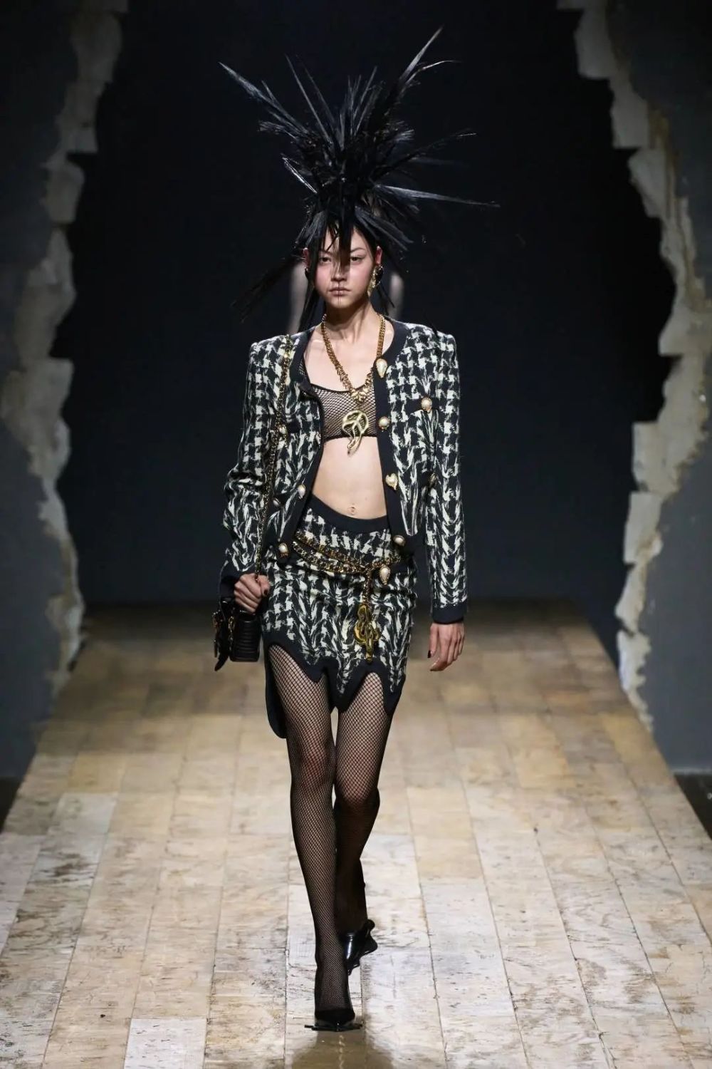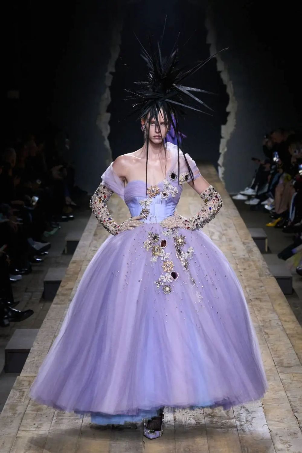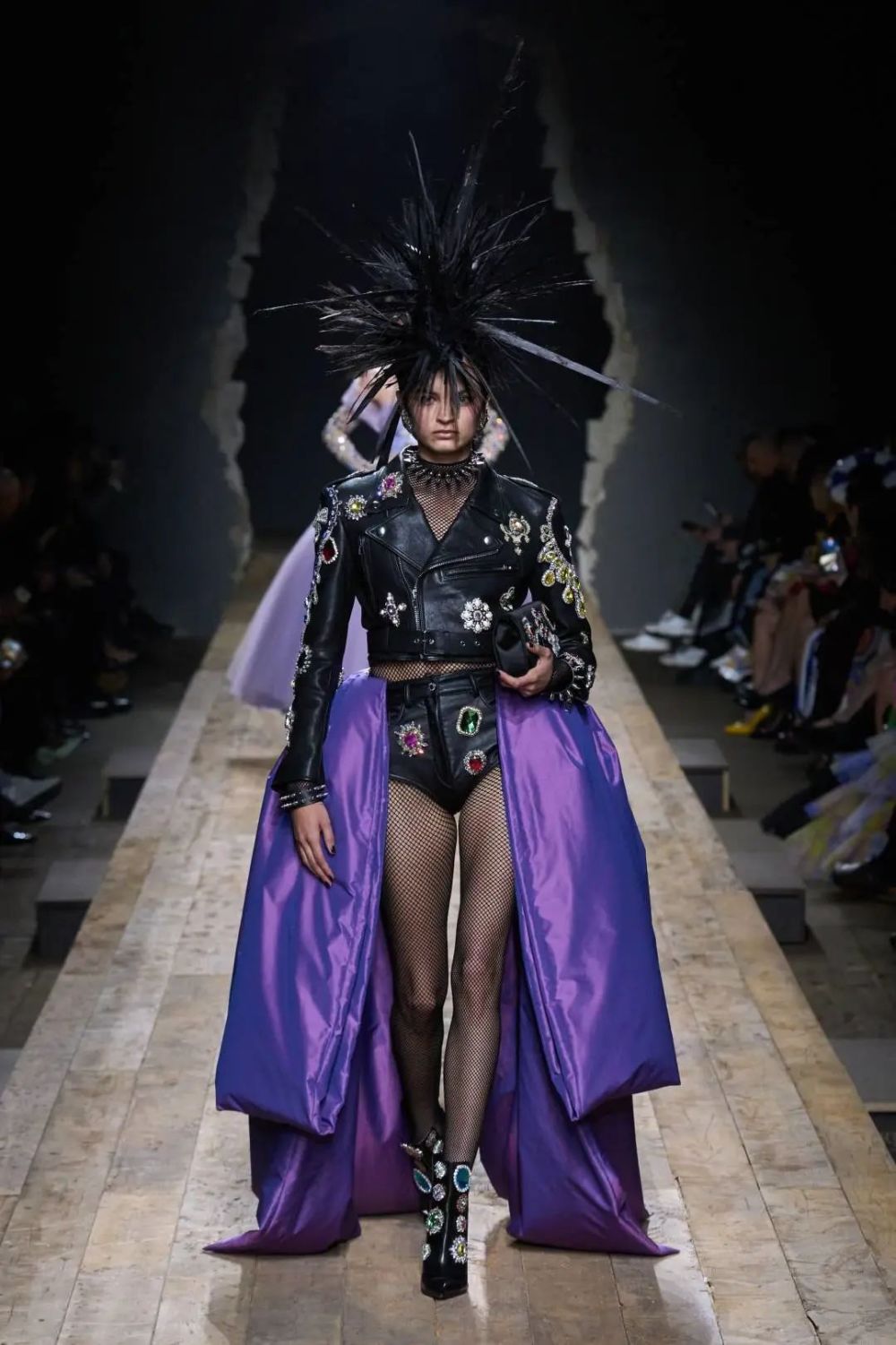 充满颓废气息的朋克精神也是这一季的重要主题:在成衣肩缝和裙边处增加尖刺和铆钉设计;在薄纱裙摆上绣满珠宝首饰;复古流苏连衣裙…这是一种带有超现实主义色彩的叛逆先锋感,也是一种被不守旧的皇室精神所浸染的反叛精神。