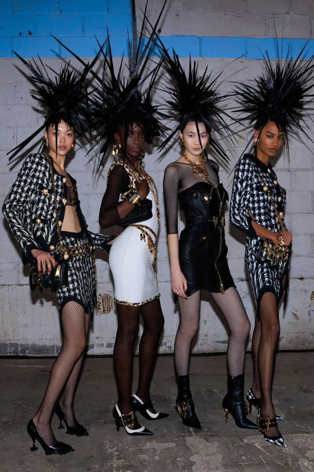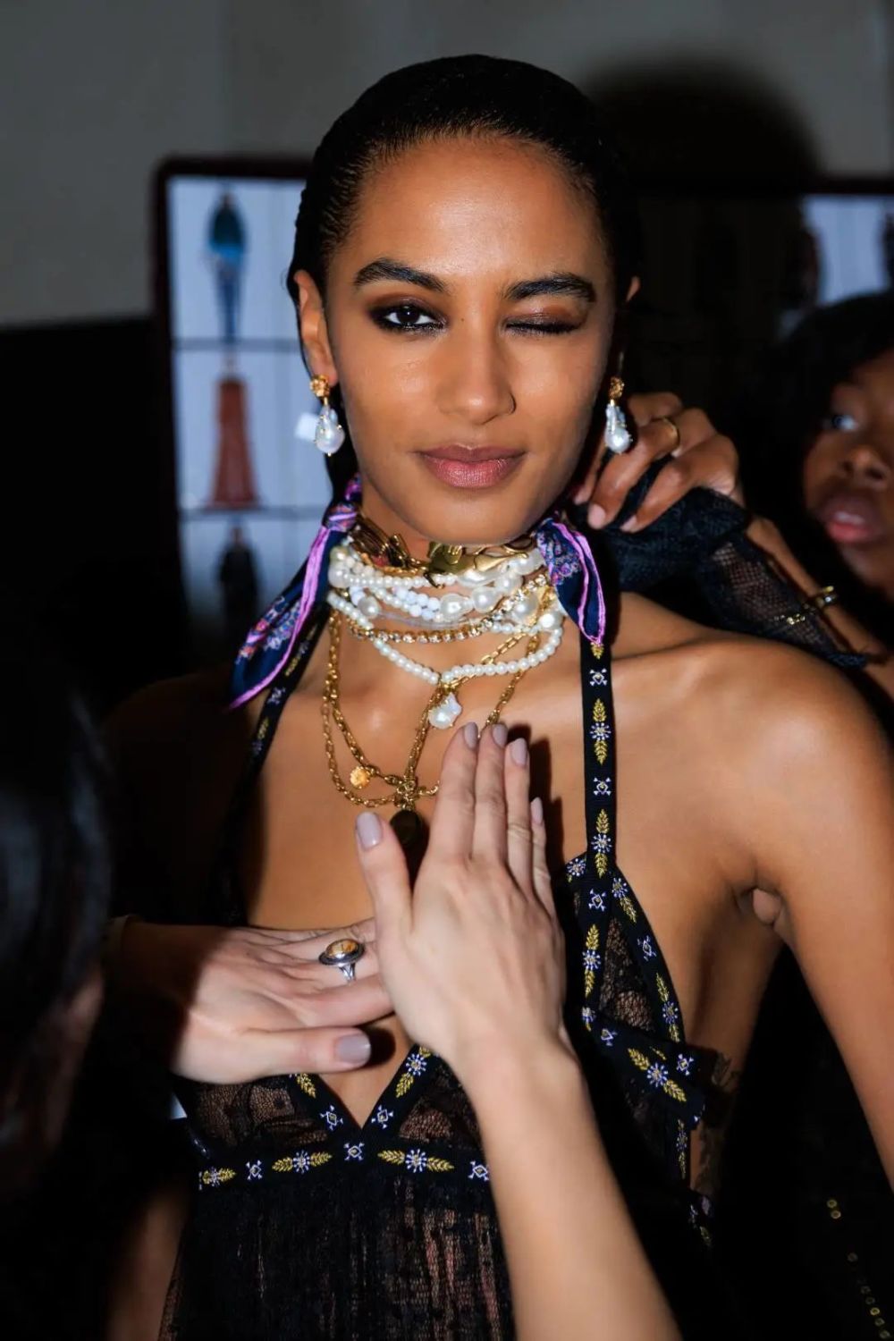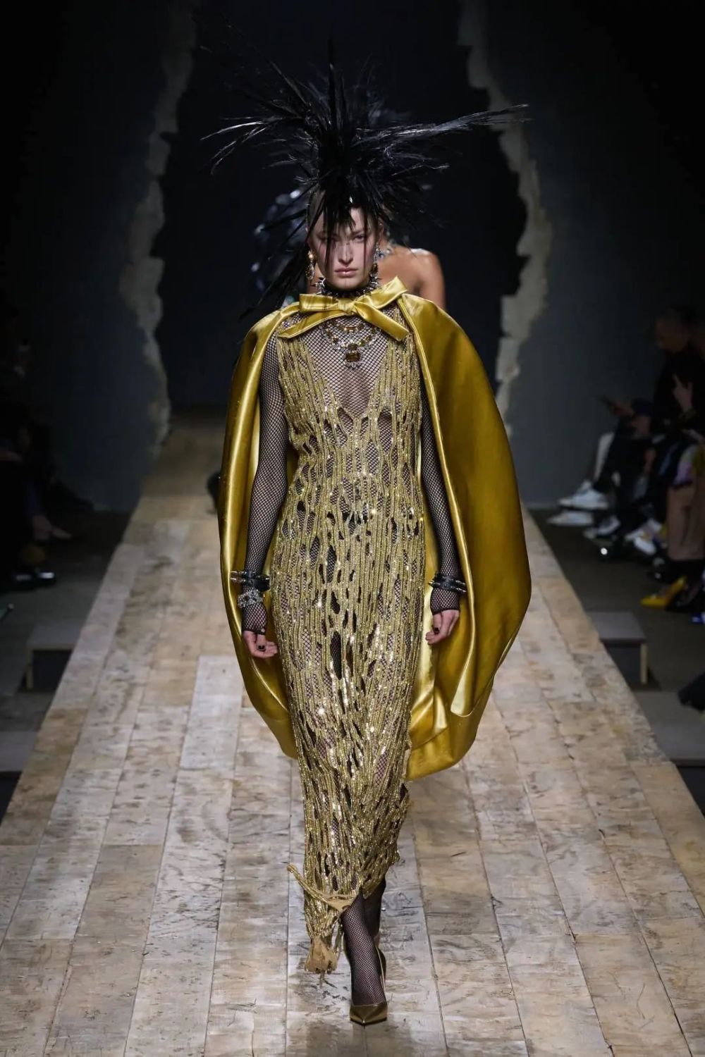 充满颓废气息的朋克精神也是这一季的重要主题:在成衣肩缝和裙边处增加尖刺和铆钉设计;在薄纱裙摆上绣满珠宝首饰;复古流苏连衣裙…这是一种带有超现实主义色彩的叛逆先锋感,也是一种被不守旧的皇室精神所浸染的反叛精神。