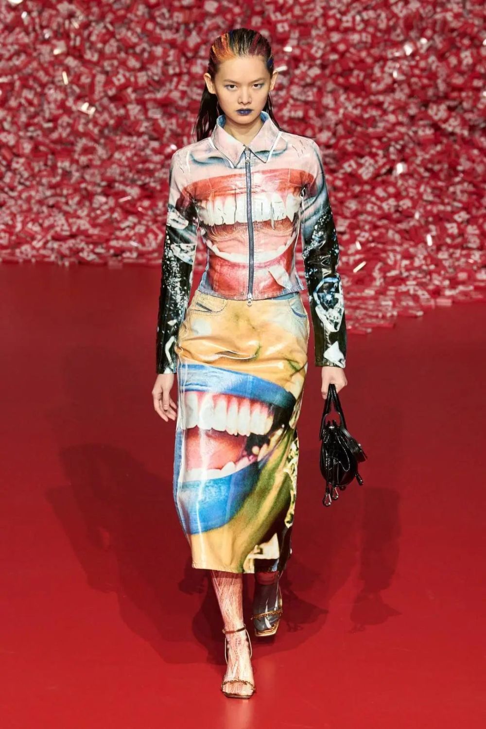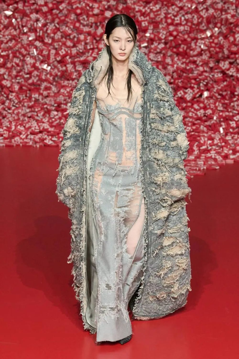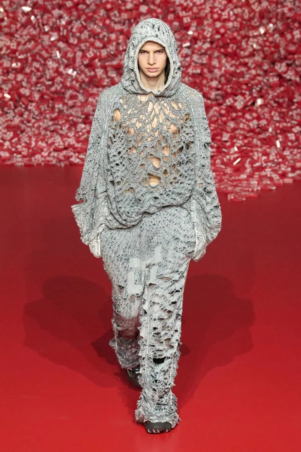 秀场中央堆满了 200,000 个猩红色杜蕾斯纸盒,充满视觉冲击力。整个系列都在探索自由、快乐和实验的主题。模特穿着经过特殊处理的欧根纱丹宁面料、印有搞怪的人脸的数码印花、涂抹金属色泽颜料的皮革材质,展现着?Glenn Martens 带给新世代的性感。