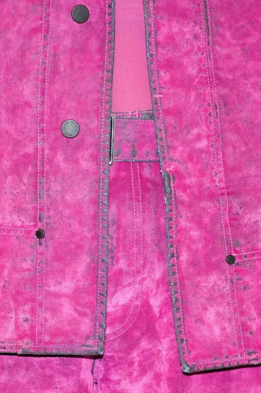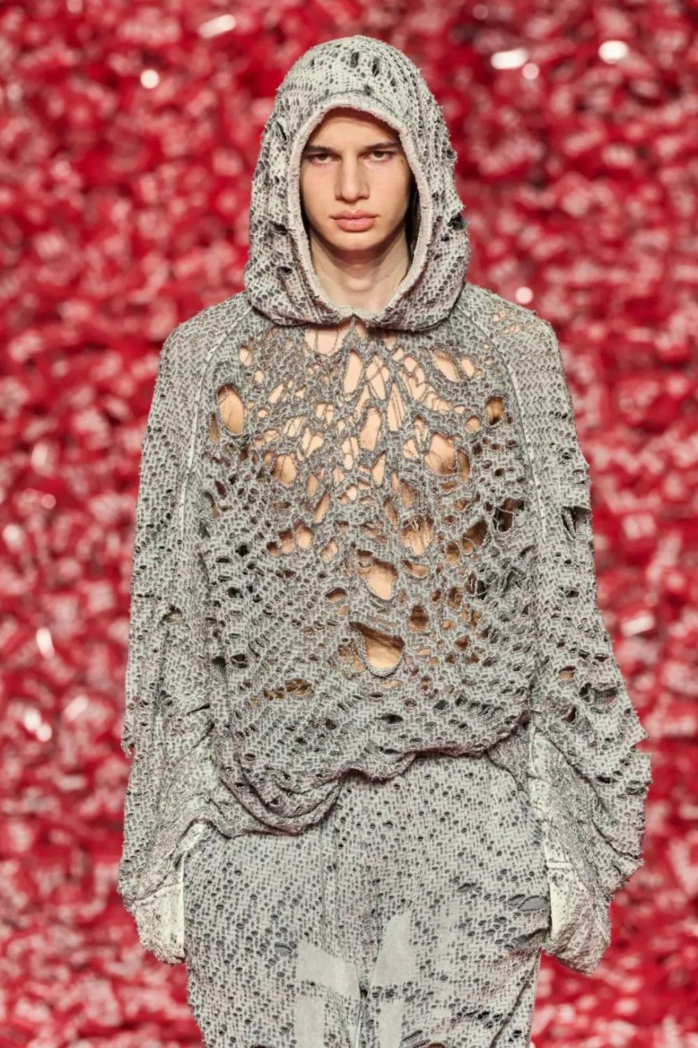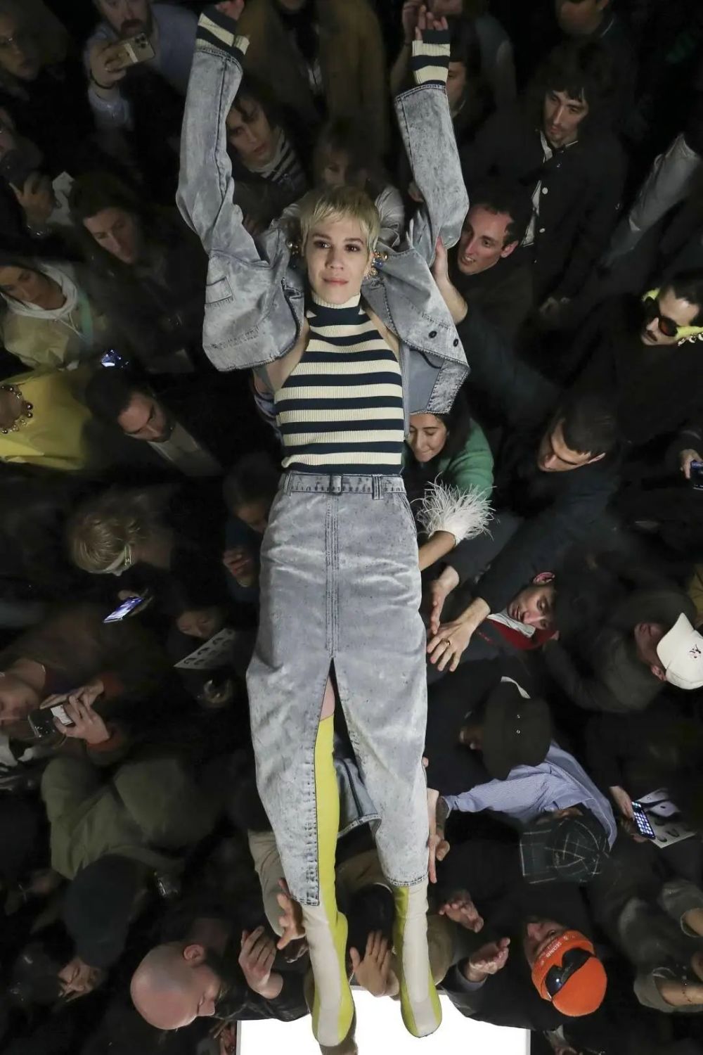 秀场中央堆满了 200,000 个猩红色杜蕾斯纸盒,充满视觉冲击力。整个系列都在探索自由、快乐和实验的主题。模特穿着经过特殊处理的欧根纱丹宁面料、印有搞怪的人脸的数码印花、涂抹金属色泽颜料的皮革材质,展现着?Glenn Martens 带给新世代的性感。