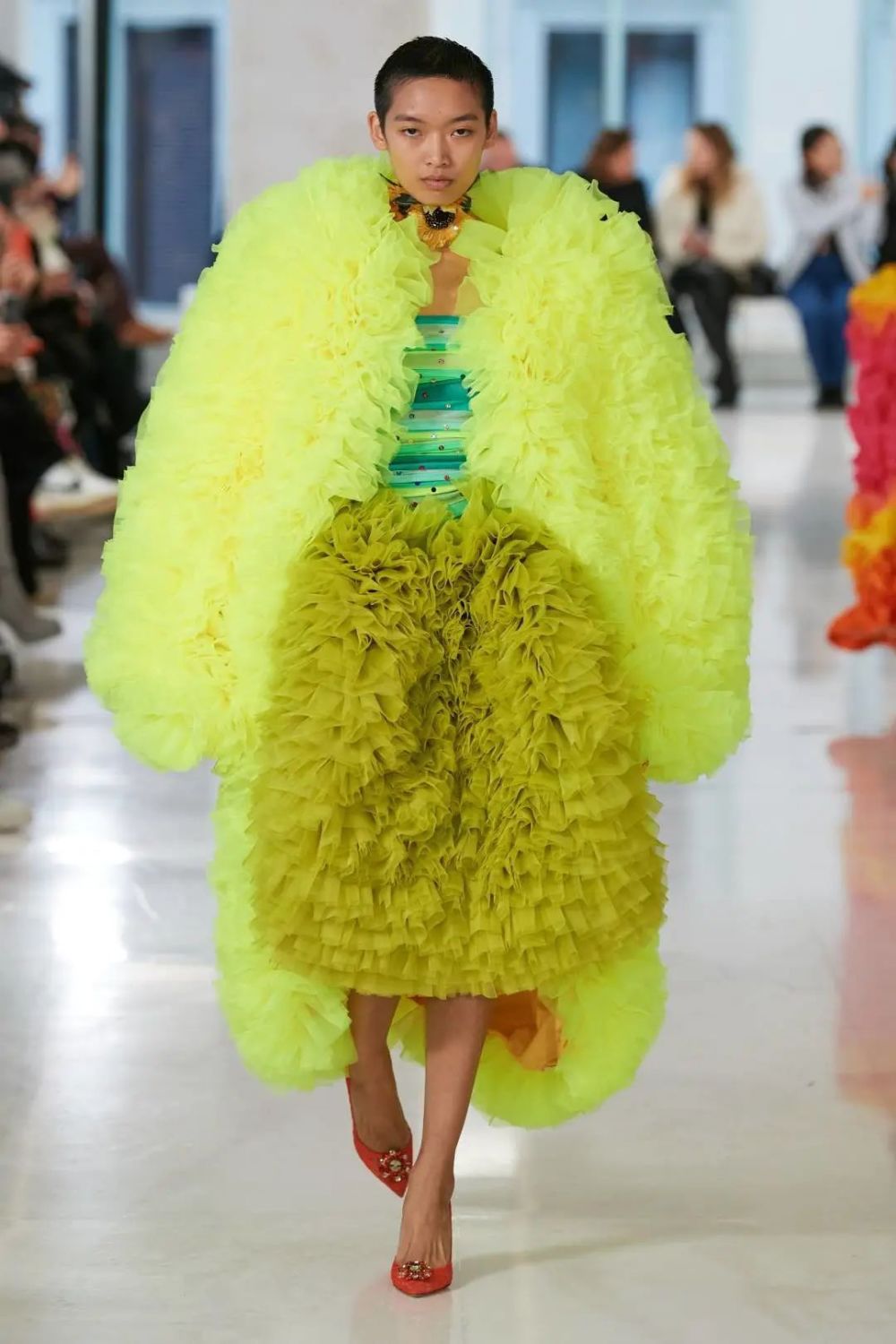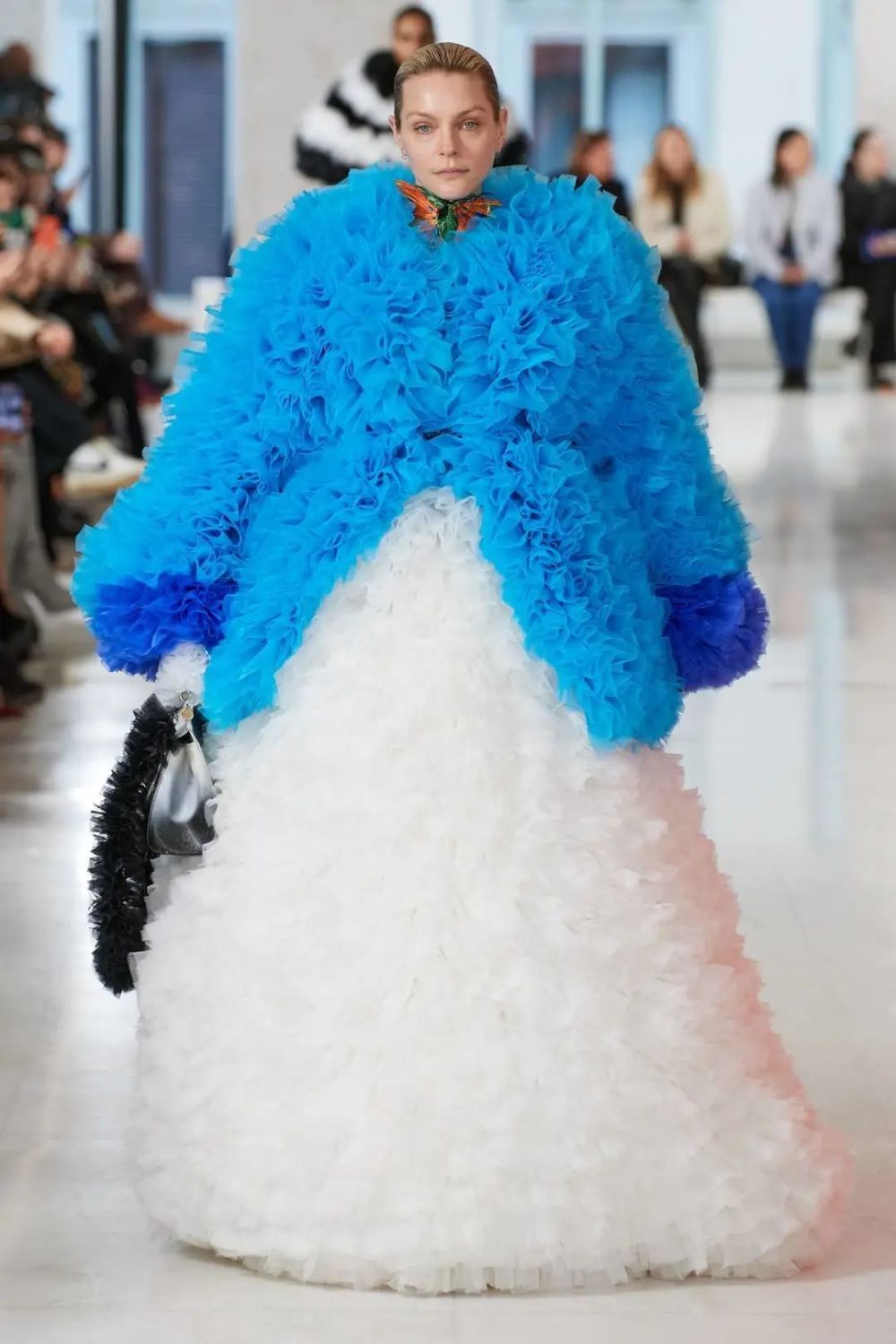 这种蓬松、大体积的裁剪手法是?Tomo Koizumi 独创的 “Tomo 植绒” 缝制方法,一次将布料缝合好几英寸,使得大量布料像杯子中的水一样爆裂溢出,充满体积感,成为他最标志性的设计元素。