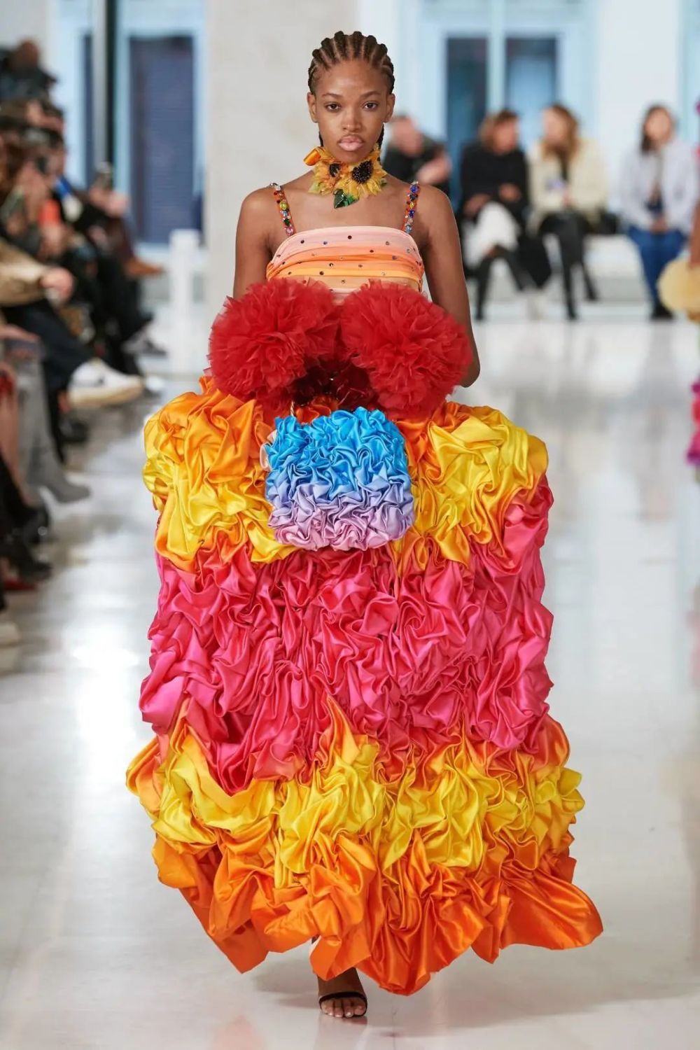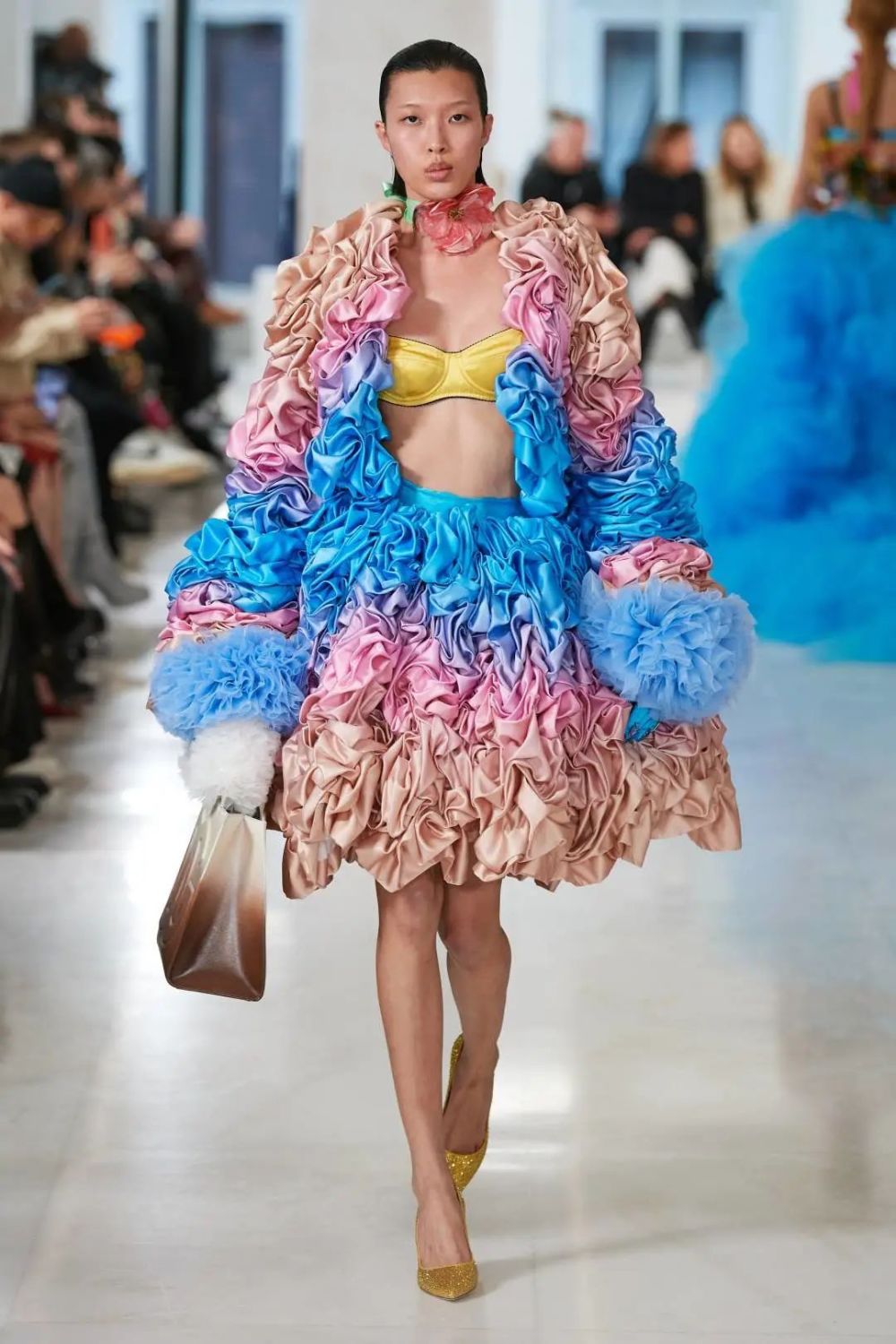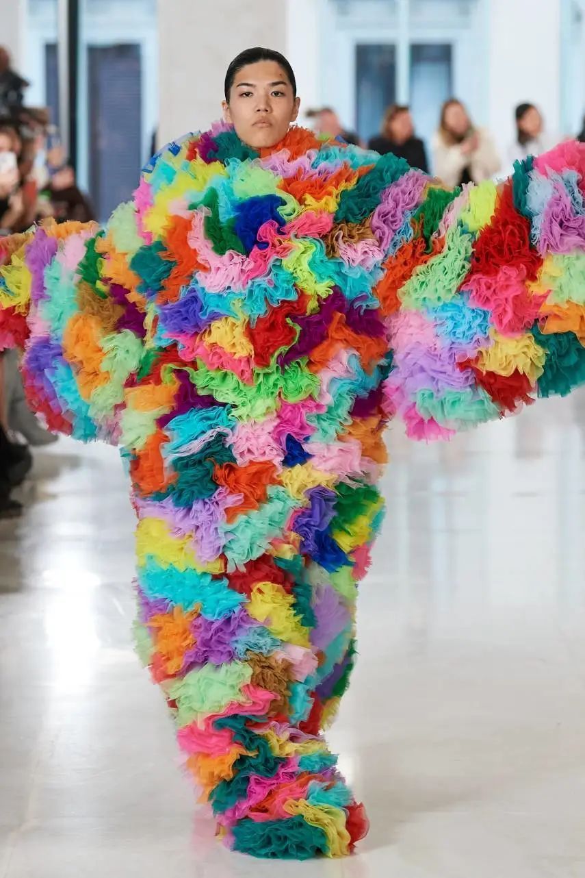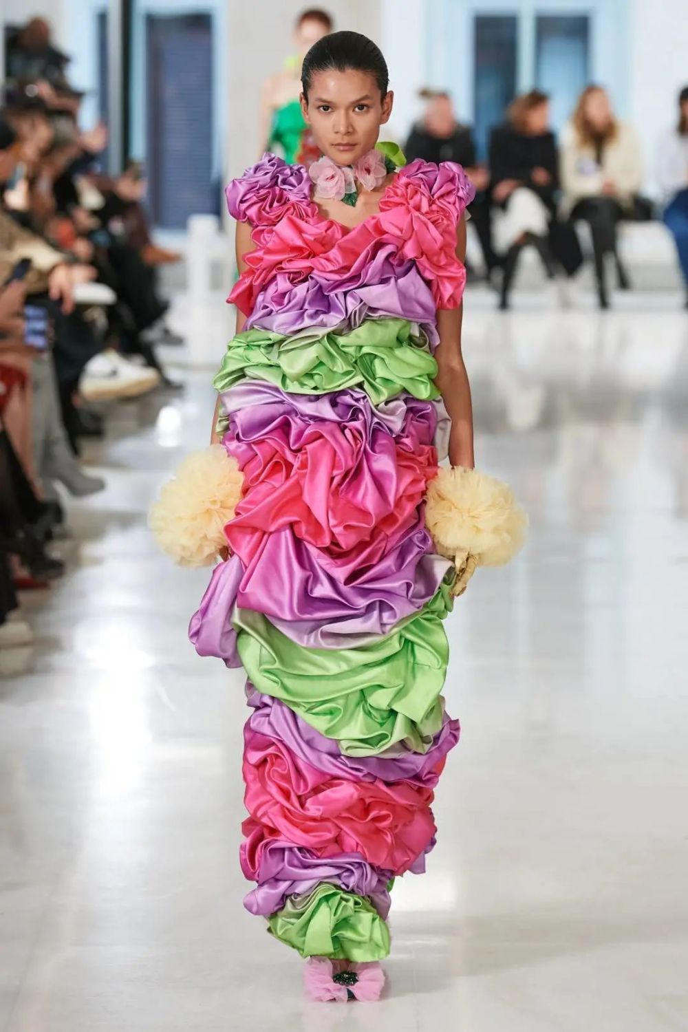 秀场在?Dolce & Gabbana 米兰总部,设计师将这个系列命名为 “Don't Forget to Bring Your Flowers(不要忘记带上你的花)”,模特们在 T 台上穿着五颜六色、蓬松梦幻的超大号礼服,像彩虹一样绚烂。设计师说,这是他送给米兰人民的花束。