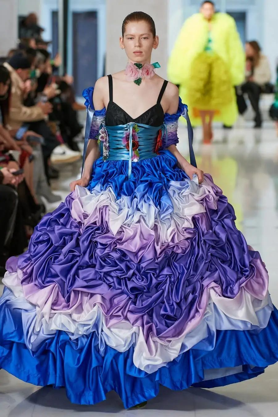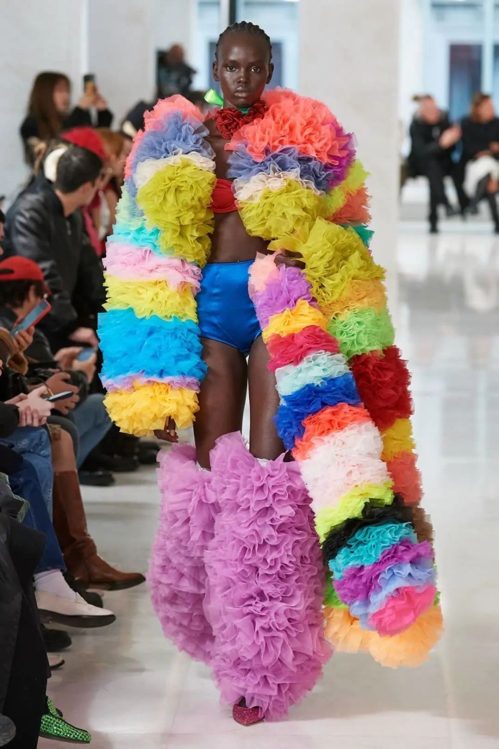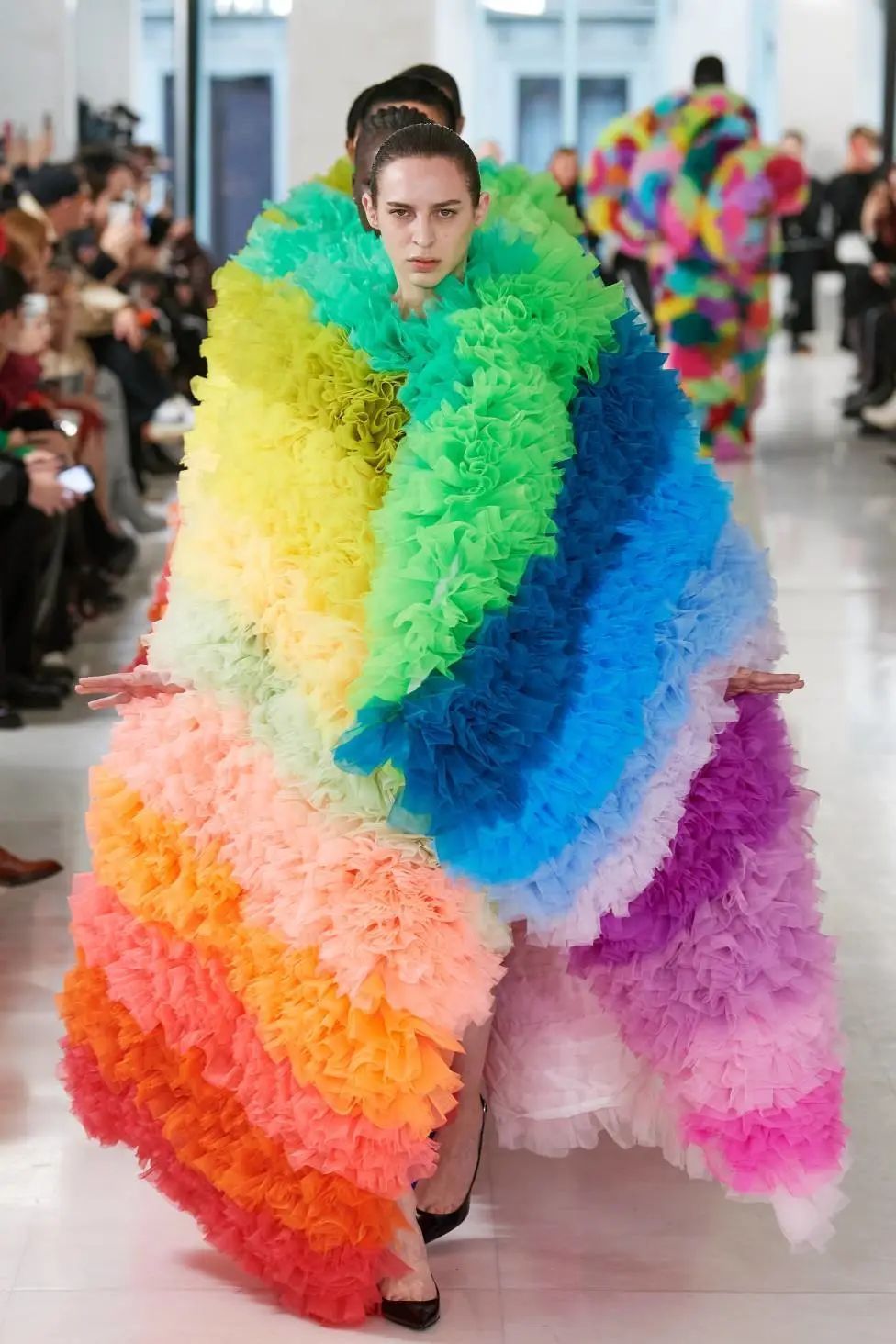 秀场在?Dolce & Gabbana 米兰总部,设计师将这个系列命名为 “Don't Forget to Bring Your Flowers(不要忘记带上你的花)”,模特们在 T 台上穿着五颜六色、蓬松梦幻的超大号礼服,像彩虹一样绚烂。设计师说,这是他送给米兰人民的花束。